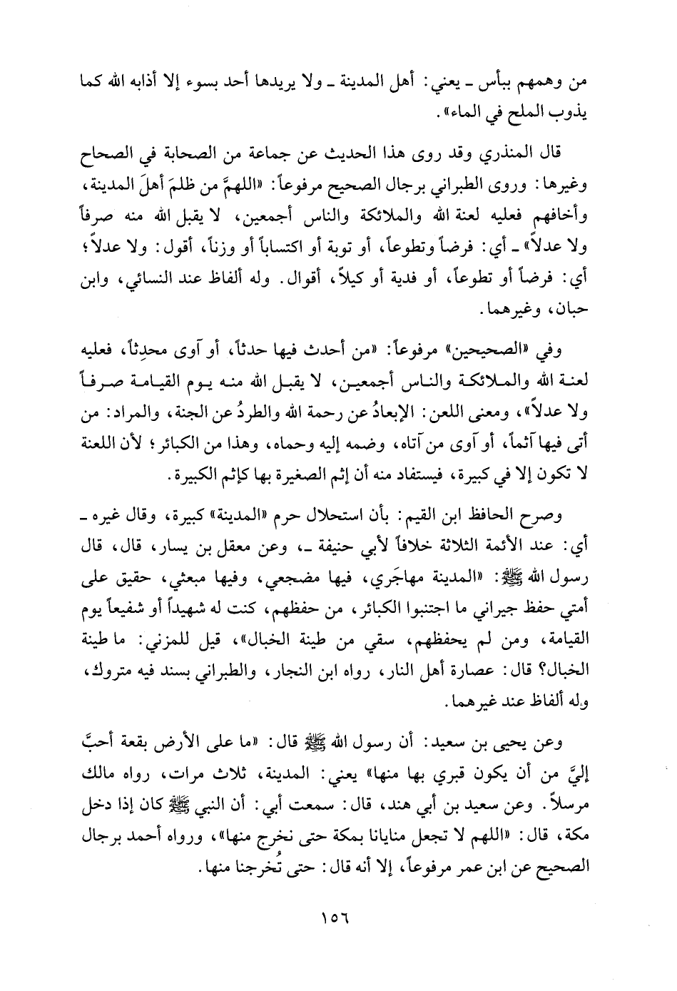 قال المنذري وقد روى هذا الحديث عن جماعة من الصحابة في الصحاح وغيرها: وروى الطبراني برجال الصحيح مرفوعاً: "اللهمَّ من ظلمَ أهلَ المدينة، وأخافهم فعليه لعنة الله والملائكة والناس أجمعين، لا يقبل الله منه صرفاً ولا عدلاً" -أي: فرضاً وتطوعاً، أو توبة أو اكتساباً أو وزناً، أقول: ولا عدلاً؛ أي: فرضاً أو تطوعاً، أو فدية أو كيلاً، أقوال. وله ألفاظ عند النسائي، وابن حبان، وغيرهما.