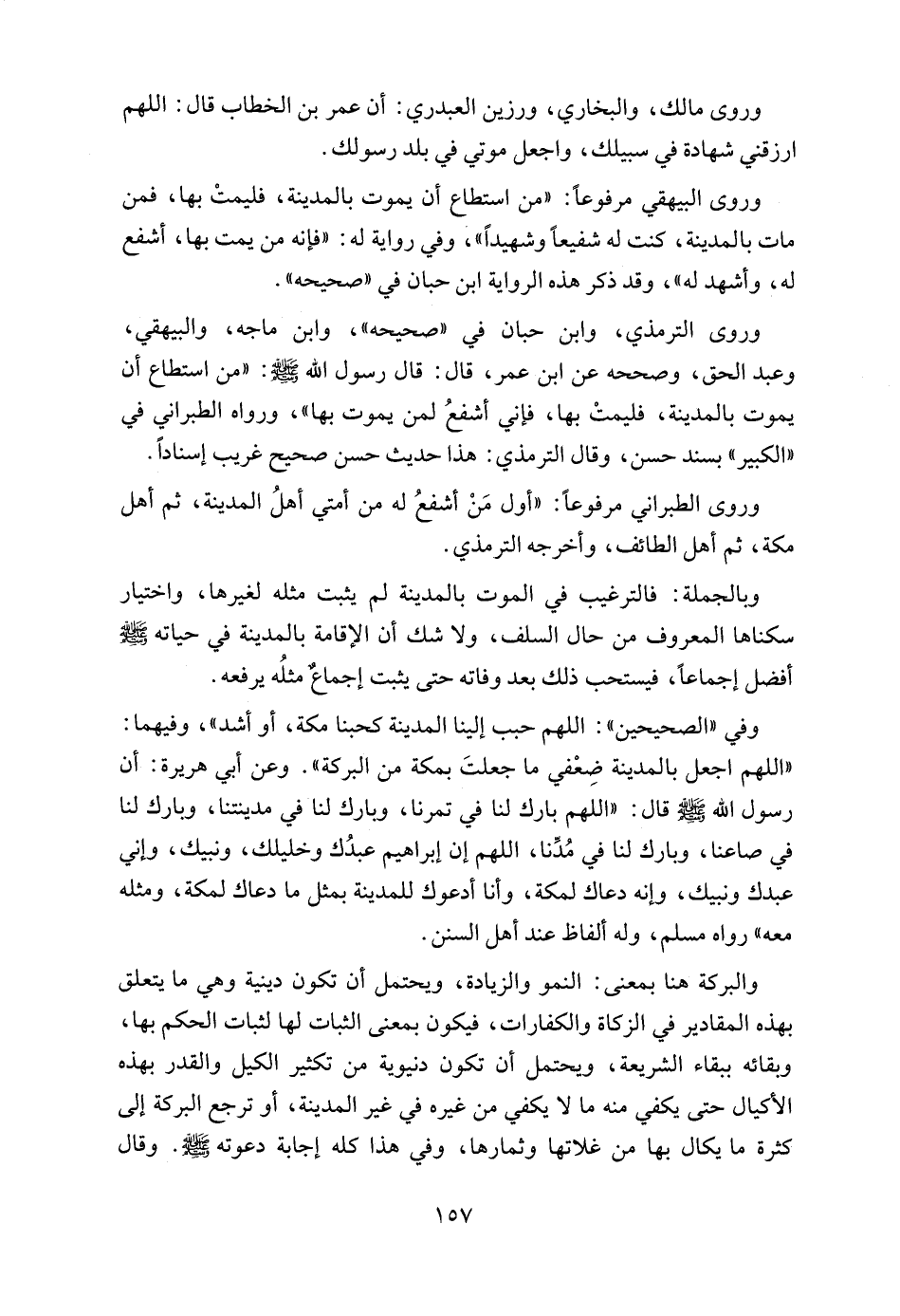 وروى البيهقي مرفوعاً: "من استطاع أن يموت بالمدينة، فليمتْ بها، فمن مات بالمدينة، كنت له شفيعاً وشهيداً"، وفي رواية له: "فإنه من يمت بها، أشفع له، وأشهد له"، وقد ذكر هذه الرواية ابن حبان في "صحيحه".