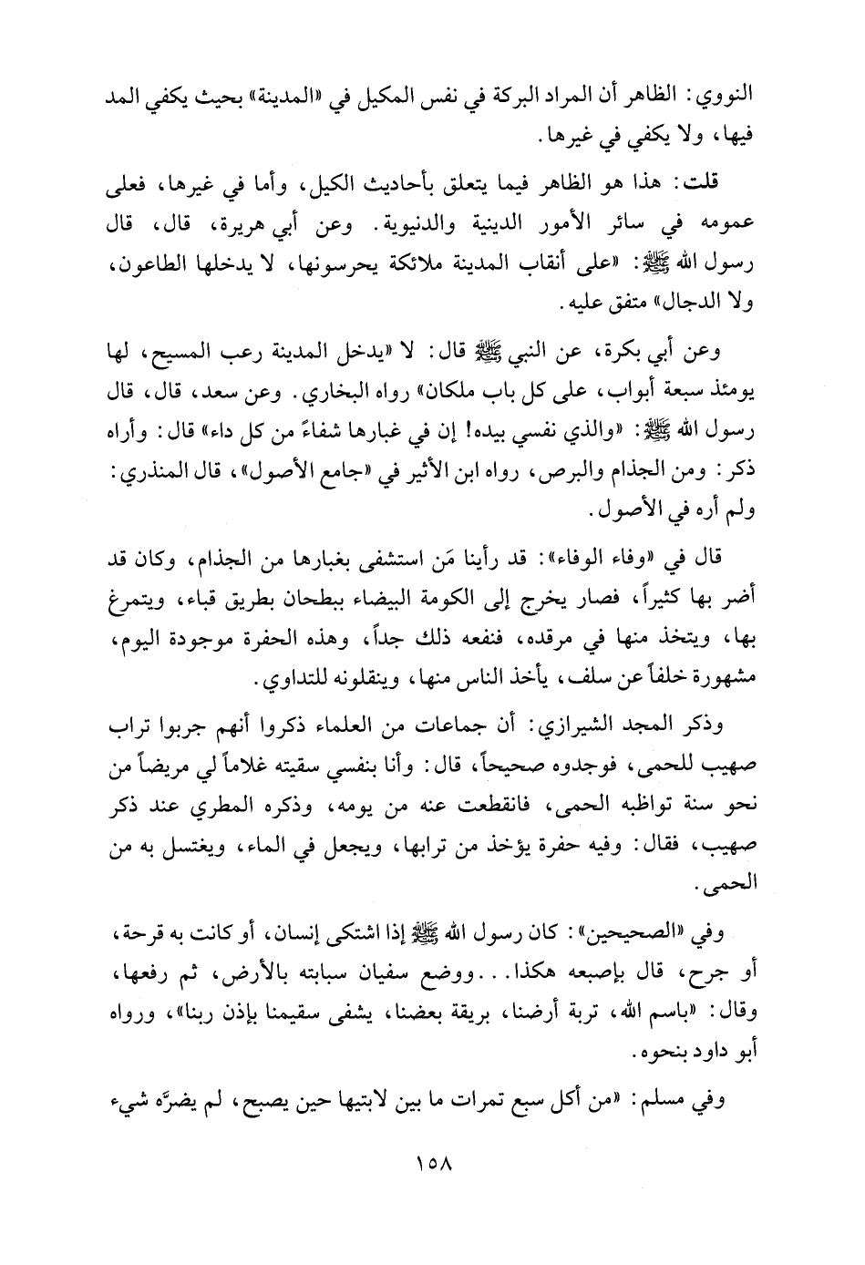 وعن أبي بكرة، عن النبي - صلى الله عليه وسلم - قال: لا "يدخل المدينة رعب المسيح، لها يومئذ سبعة أبواب، على كل باب ملكان" رواه البخاري. وعن سعد، قال، قال رسول الله - صلى الله عليه وسلم -: "والذي نفسي بيده! إن في غبارها شفاءً من كل داء" قال: وأراه ذكر: ومن الجذام والبرص، رواه ابن الأثير في "جامع الأصول"، قال المنذري: ولم أره في الأصول.