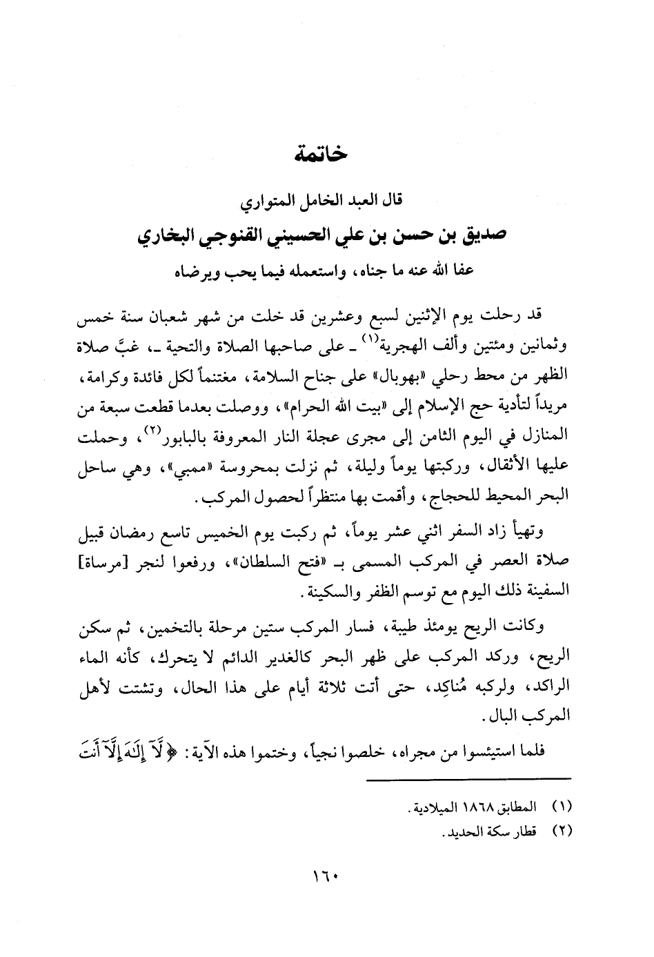 قد رحلت يوم الإثنين لسبع وعشرين قد خلت من شهر شعبان سنة خمس وثمانين ومئتين وألف الهجرية (¬1) -على صاحبها الصلاة والتحية-، غبَّ صلاة الظهر من محط رحلي "بهوبال" على جناح السلامة، مغتنماً لكل فائدة وكرامة، مريداً لتأدية حج الإسلام إلى "بيت الله الحرام"، ووصلت بعدما قطعت سبعة من المنازل في اليوم الثامن إلى مجرى عجلة النار المعروفة بالبابور (¬2)، وحملت عليها الأثقال، وركبتها يوماً وليلة، ثم نزلت بمحروسة "ممبي"، وهي ساحل البحر المحيط للحجاج، وأقمت بها منتظراً لحصول المركب.