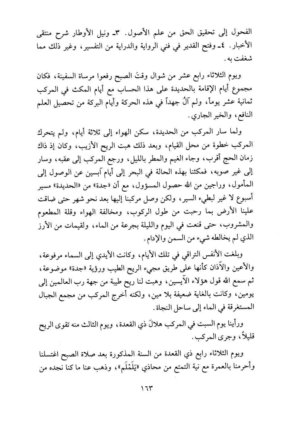 ويوم الثلاثاء رابع عشر من شوال وقتَ الصبح رفعوا مرساة السفينة، فكان مجموع أيام الإقامة بالحديدة على هذا الحساب مع أيام المكث في المركب ثمانية عشر يوماً، ولم آلُ جهداً في هذه الحركة وأيام البركة من تحصيل العلم النافع، والخير الجاري.