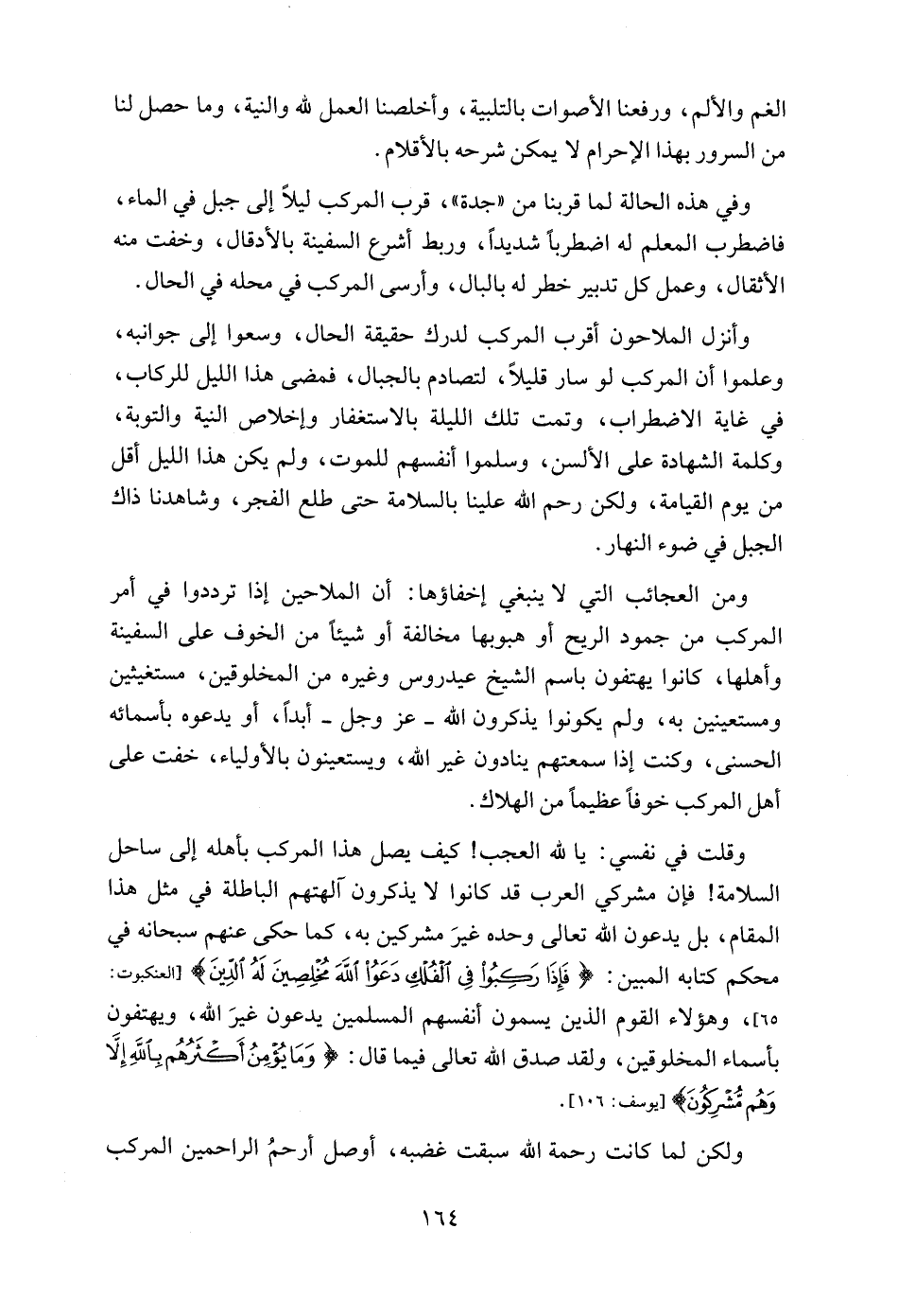 وقلت في نفسي: يا لله العجب! كيف يصل هذا المركب بأهله إلى ساحل السلامة! فإن مشركي العرب قد كانوا لا يذكرون آلهتهم الباطلة في مثل هذا المقام، بل يدعون الله تعالى وحده غيرَ مشركين به، كما حكى عنهم سبحانه في محكم كتابه المبين: {فَإِذَا رَكِبُوا فِي الْفُلْكِ دَعَوُا اللَّهَ مُخْلِصِينَ لَهُ الدِّينَ} [العنكبوت: 65]، وهؤلاء القوم الذين يسمون أنفسهم المسلمين يدعون غيرَ الله، ويهتفون بأسماء المخلوقين، ولقد صدق الله تعالى فيما قال: {وَمَا يُؤْمِنُ أَكْثَرُهُمْ بِاللَّهِ إِلَّا وَهُمْ مُشْرِكُونَ} [يوسف: 106].