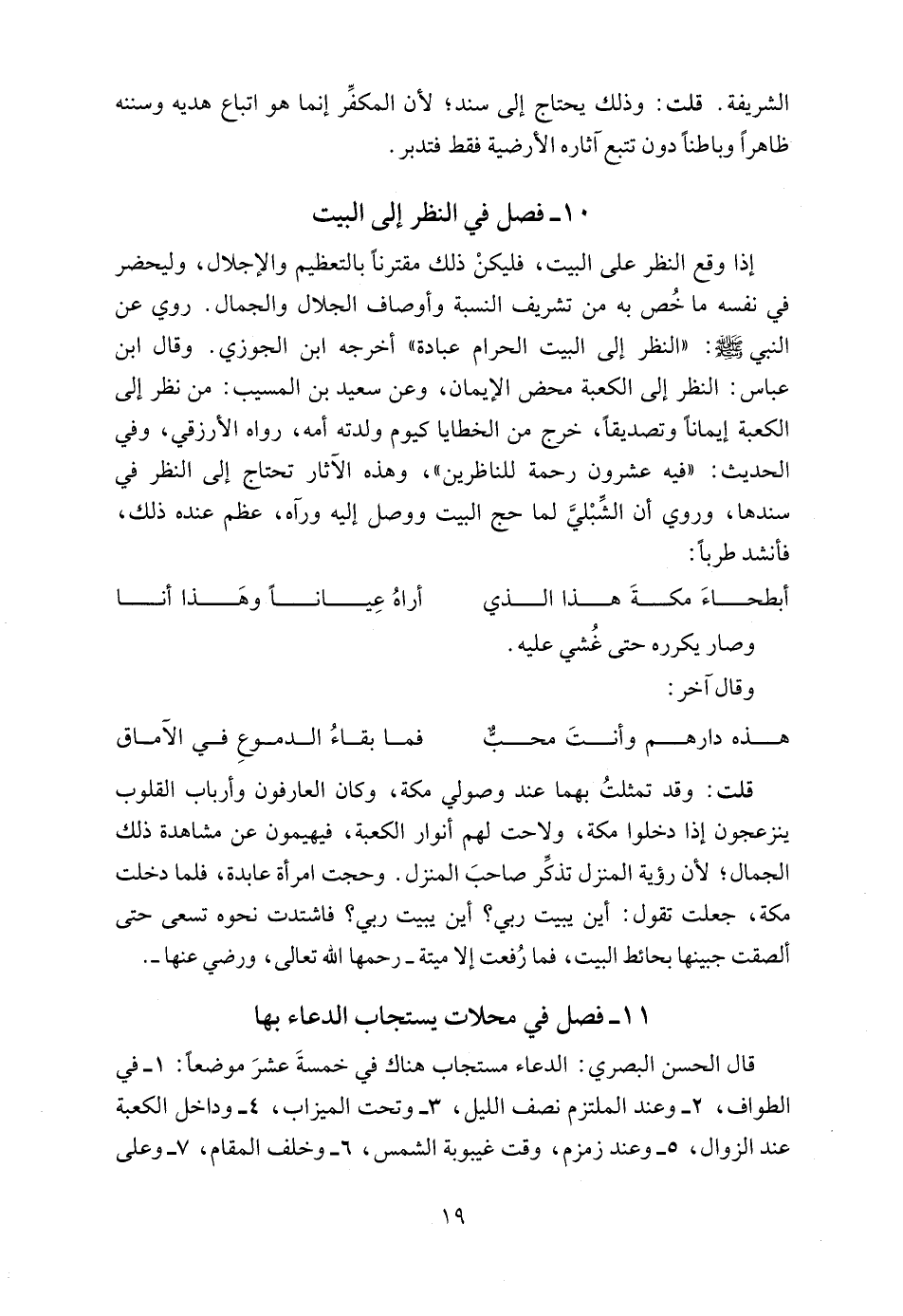 إذا وقع النظر على البيت، فليكنْ ذلك مقترناً بالتعظيم والإجلال، وليحضر في نفسه ما خُص به من تشريف النسبة وأوصاف الجلال والجمال. روي عن النبي - صلى الله عليه وسلم -: "النظر إلى البيت الحرام عبادة" أخرجه ابن الجوزي. وقال ابن عباس: النظر إلى الكعبة محض الإيمان، وعن سعيد بن المسيب: من نظر إلى الكعبة إيماناً وتصديقاً، خرج من الخطايا كيوم ولدته أمه، رواه الأرزقي، وفي الحديث: "فيه عشرون رحمة للناظرين"، وهذه الآثار تحتاج إلى النظر في سندها، وروي أن الشِّبْليَّ لما حج البيت ووصل إليه ورآه، عظم عنده ذلك، فأنشد طرباً: