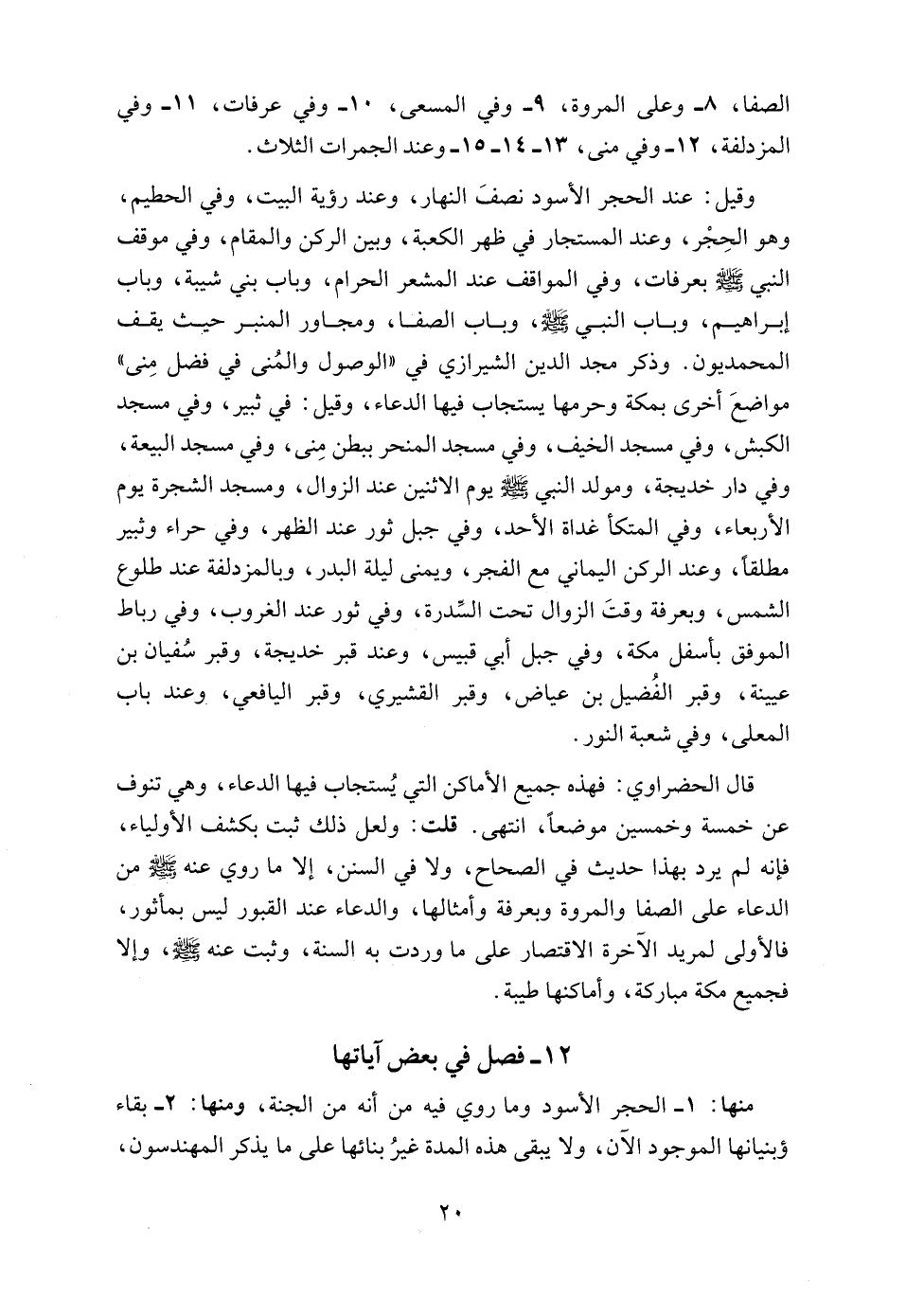 قال الحضراوي: فهذه جميع الأماكن التي يُستجاب فيها الدعاء، وهي تنوف عن خمسة وخمسين موضعاً، انتهى. قلت: ولعل ذلك ثبت بكشف الأولياء، فإنه لم يرد بهذا حديث في الصحاح، ولا في السنن، إلا ما روي عنه - صلى الله عليه وسلم - من الدعاء على الصفا والمروة وبعرفة وأمثالها، والدعاء عند القبور ليس بمأثور، فالأولى لمريد الآخرة الاقتصار على ما وردت به السنة، وثبت عنه - صلى الله عليه وسلم -، وإلا فجميع مكة مباركة، وأماكنها طيبة.