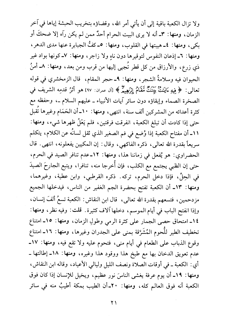 9 - حجر المقام، قال الزمخشري في قوله تعالى: {فِيهِ آيَاتٌ بَيِّنَاتٌ مَقَامُ إِبْرَاهِيمَ} [آل عمران: 97] هو أثرُ قدمِه الشريف في الصخرة الصماء وإبقاؤه دون سائر آيات الأنبياء -عليهم السلام-، وحفظه مع كثرة أعدائه من المشركين ألف سنة، انتهى، ومنها: