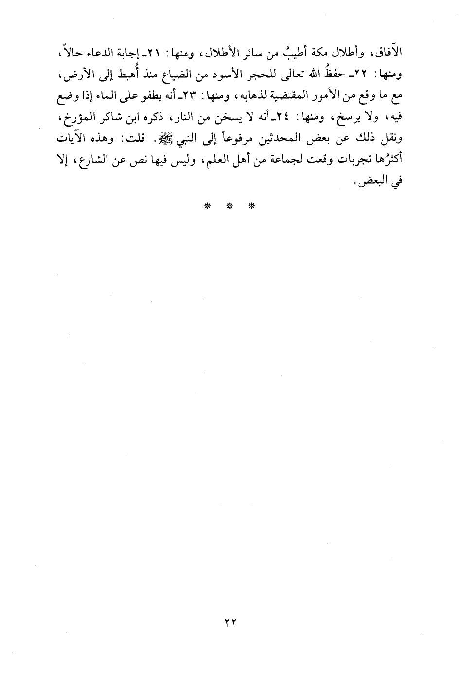 24 - أنه لا يسخن من النار، ذكره ابن شاكر المؤرخ، ونقل ذلك عن بعض المحدثين مرفوعاً إلى النبي - صلى الله عليه وسلم -. قلت: وهذه الآيات أكثرُها تجربات وقعت لجماعة من أهل العلم، وليس فيها نص عن الشارع، إلا في البعض.