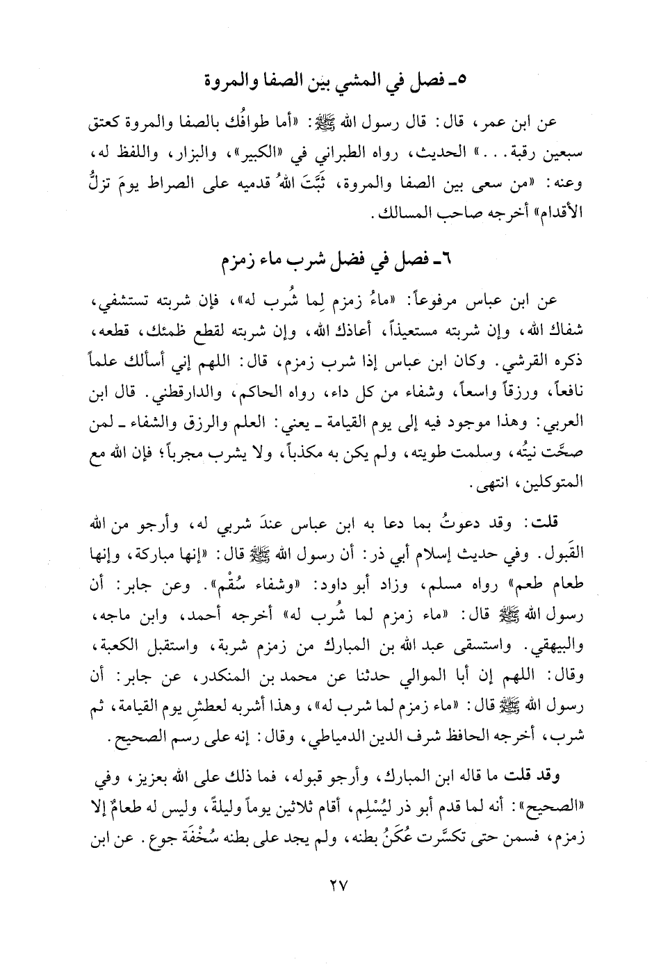 قلت: وقد دعوتُ بما دعا به ابن عباس عندَ شربي له، وأرجو من الله القَبول. وفي حديث إسلام أبي ذر: أن رسول الله - صلى الله عليه وسلم - قال: "إنها مباركة، وإنها طعام طعم" رواه مسلم، وزاد أَبو داود: "وشفاء سُقْم". وعن جابر: أن رسول الله - صلى الله عليه وسلم - قال: "ماء زمزم لما شُرب له" أخرجه أحمد، وابن ماجه، والبيهقي. واستسقى عبد الله بن المبارك من زمزم شربة، واستقبل الكعبة، وقال: اللهم إن أبا الموالي حدثنا عن محمد بن المنكدر، عن جابر: أن رسول الله - صلى الله عليه وسلم - قال: "ماء زمزم لما شرب له"، وهذا أشربه لعطشِ يوم القيامة، ثم شرب، أخرجه الحافظ شرف الدين الدمياطي، وقال: إنه على رسم الصحيح.