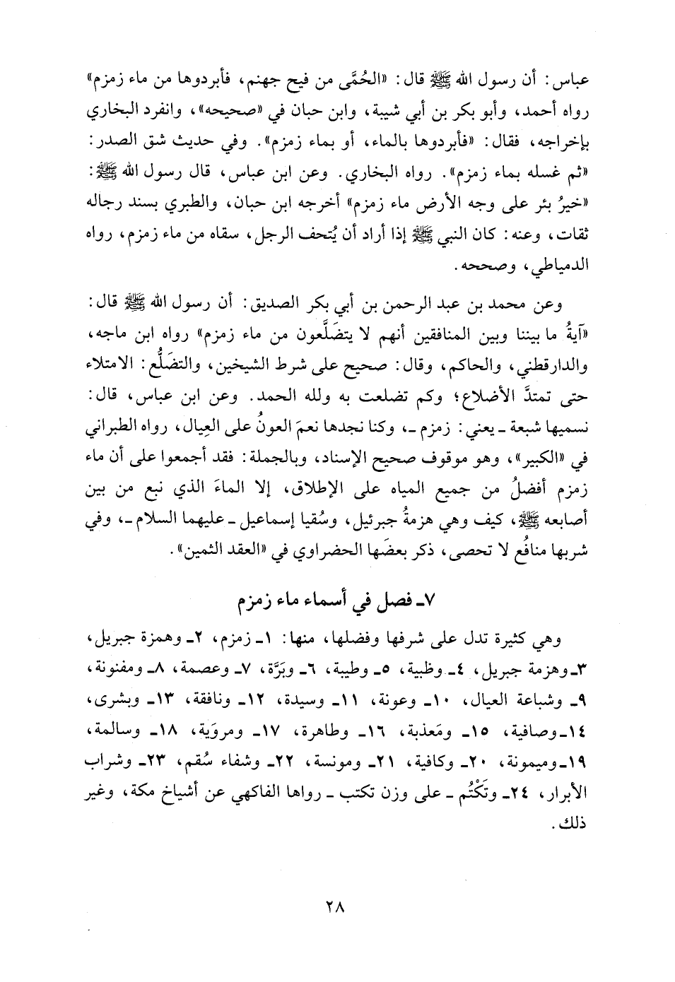 عباس: أن رسول الله - صلى الله عليه وسلم - قال: "الحُمَّى من فيح جهنم، فأبردوها من ماء زمزم" رواه أحمد، وأبو بكر بن أبي شيبة، وابن حبان في "صحيحه"، وانفرد البخاري بإخراجه، فقال: "فأبردوها بالماء، أو بماء زمزم". وفي حديث شق الصدر: "ثم غسله بماء زمزم". رواه البخاري. وعن ابن عباس، قال رسول الله - صلى الله عليه وسلم -: "خيرُ بئر على وجه الأرض ماء زمزم" أخرجه ابن حبان، والطبري بسند رجاله ثقات، وعنه: كان النبي - صلى الله عليه وسلم - إذا أراد أن يُتحف الرجل، سقاه من ماء زمزم، رواه الدمياطي، وصححه.