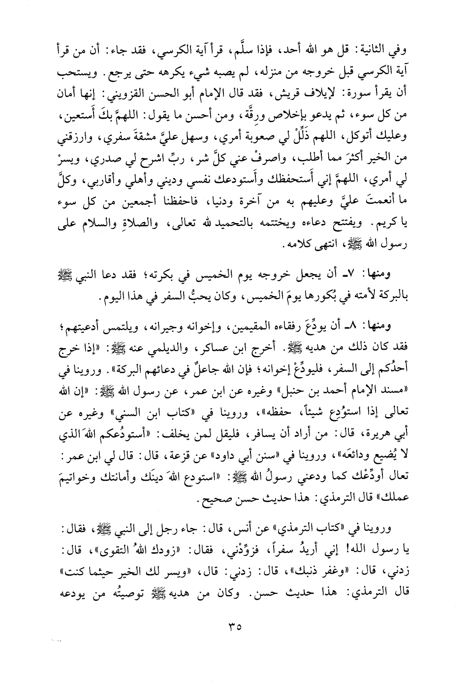 8 - أن يودِّعَ رفقاءه المقيمين، وإخوانه وجيرانه، ويلتمس أدعيتهم؛ فقد كان ذلك من هديه - صلى الله عليه وسلم -. أخرج ابن عساكر، والديلمي عنه - صلى الله عليه وسلم -: "إذا خرج أحدُكم إلى السفر، فليودِّعْ إخوانه؛ فإن الله جاعلٌ في دعائهم البركة". وروينا في "مسند الإمام أحمد بن حنبل" وغيره عن ابن عمر، عن رسول الله - صلى الله عليه وسلم -: "إن الله تعالى إذا استوُدِع شيئاً، حفظه"، وروينا في "كتاب ابن السني" وغيره عن أبي هريرة، قال: من أراد أن يسافر، فليقل لمن يخلف: "أستودُعكم اللهَ الذي لا يُضيع ودائعَه"، وروينا في "سنن أبي داود" عن قزعة، قال: قال لي ابن عمر: تعال أودِّعْك كما ودعني رسولُ الله - صلى الله عليه وسلم -: "استودع اللهَ دينَك وأمانتك وخواتيمَ عملك" قال الترمذي: هذا حديث حسن صحيح.