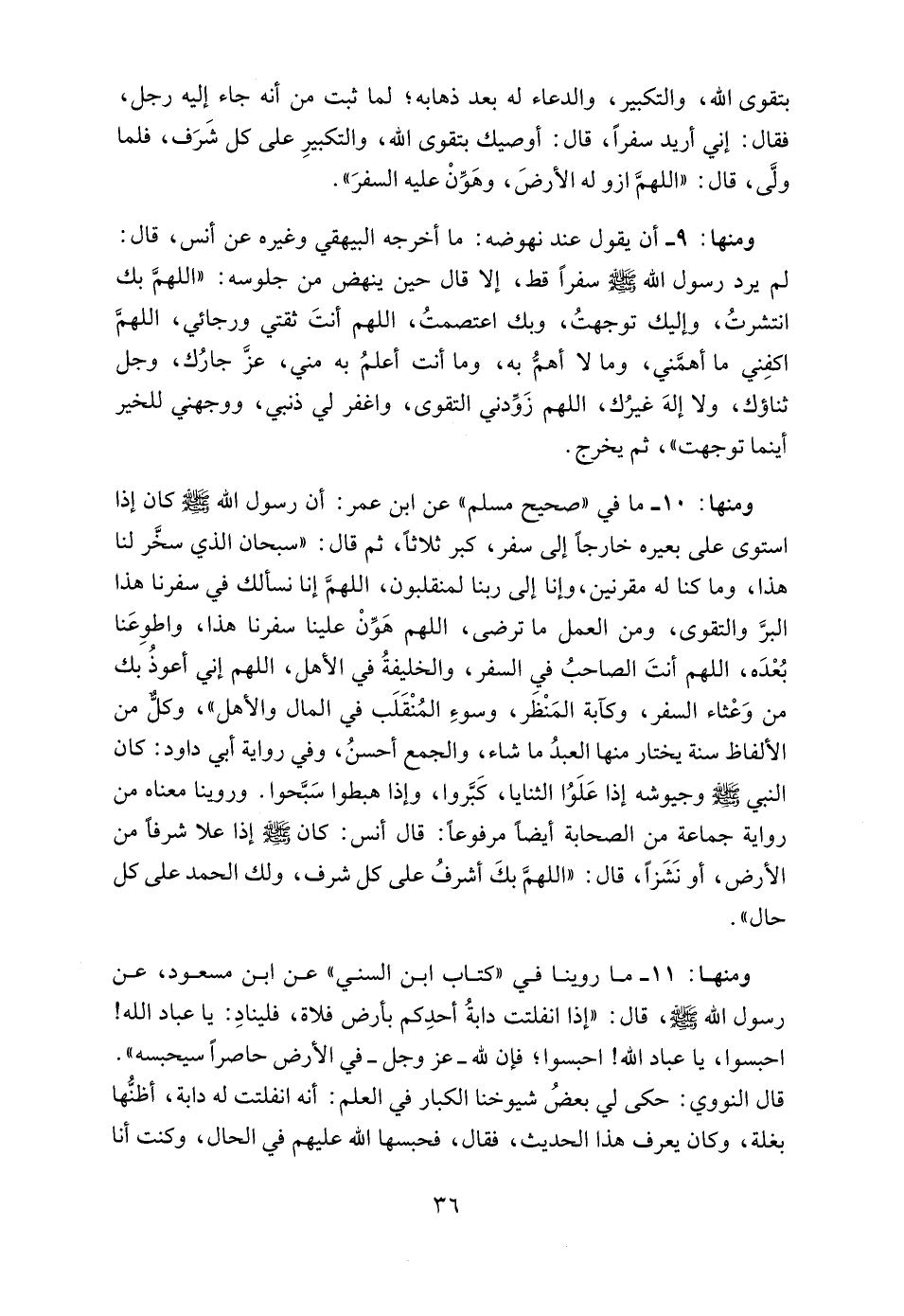 10 - ما في "صحيح مسلم" عن ابن عمر: أن رسول الله - صلى الله عليه وسلم - كان إذا استوى على بعيره خارجاً إلى سفر، كبر ثلاثاً، ثم قال: "سبحان الذي سخَّر لنا هذا، وما كنا له مقرنين، وإنا إلى ربنا لمنقلبون، اللهمَّ إنا نسألك في سفرنا هذا البرَّ والتقوى، ومن العمل ما ترضى، اللهم هَوِّنْ علينا سفرنا هذا، واطوِعَنا بُعْدَه، اللهم أنتَ الصاحبُ في السفر، والخليفةُ في الأهل، اللهم إني أعوذُ بك من وَعْثاء السفر، وكآبة المَنْظَر، وسوءِ المُنْقَلَب في المال والأهل"، وكلٌّ من الألفاظ سنة يختار منها العبدُ ما شاء، والجمع أحسنُ، وفي رواية أبي داود: كان النبي - صلى الله عليه وسلم - وجيوشه إذا عَلَوُا الثنايا، كَبَّروا، وإذا هبطوا سَبَّحوا. وروينا معناه من رواية جماعة من الصحابة أيضاً مرفوعاً: قال أنس: كان - صلى الله عليه وسلم - إذا علا شرفاً من الأرض، أو نَشَزاً، قال: "اللهمَّ بكَ أشرفُ على كل شرف، ولك الحمد على كل حال".