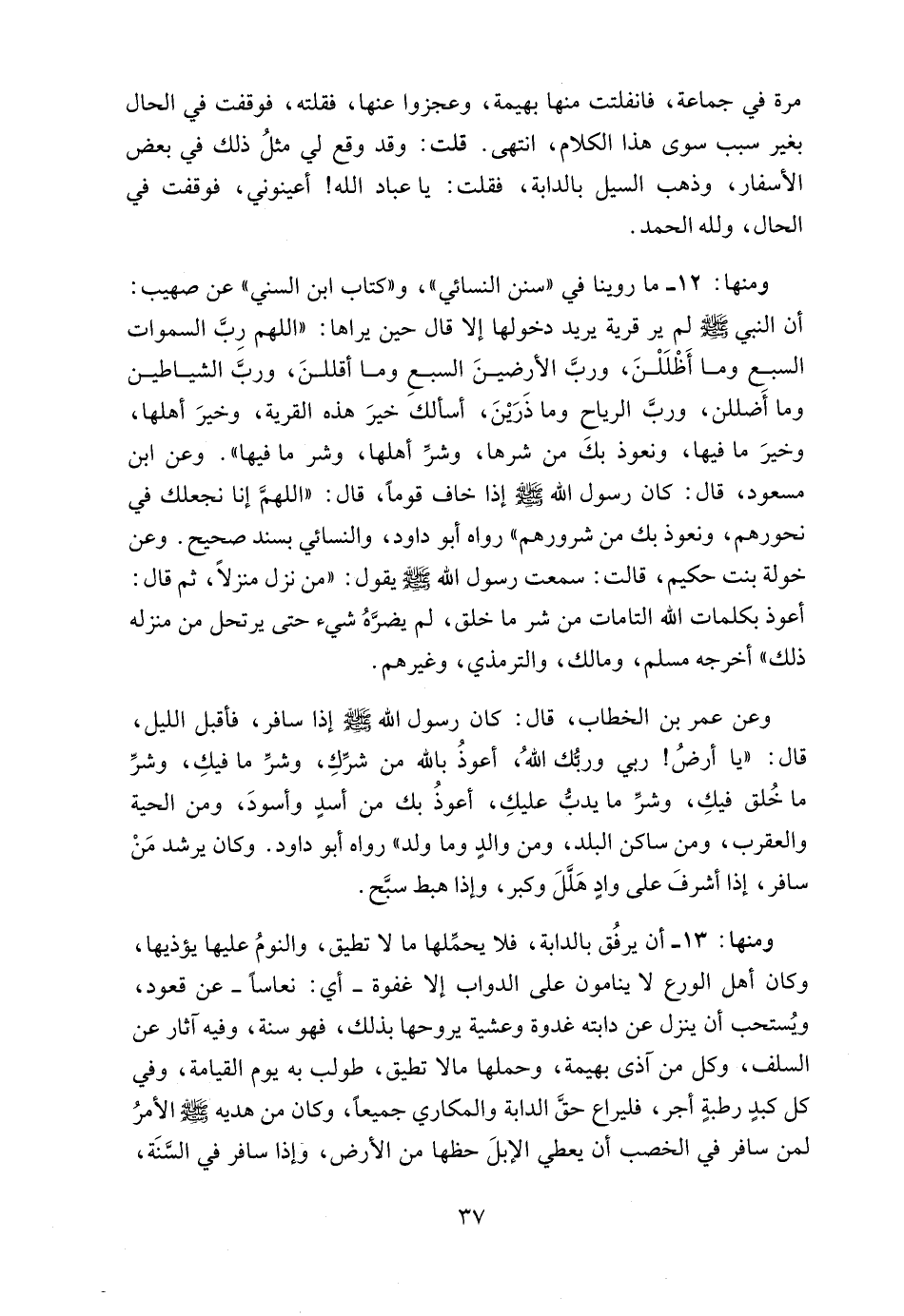13 - أن يرفُق بالدابة، فلا يحمِّلها ما لا تطيق، والنومُ عليها يؤذيها، وكان أهل الورع لا ينامون على الدواب إلا غفوة -أي: نعاساً- عن قعود، ويُستحب أن ينزل عن دابته غدوة وعشية يروحها بذلك، فهو سنة، وفيه آثار عن السلف، وكل من آذى بهيمة، وحملها ما لا تطيق، طولب به يوم القيامة، وفي كل كبدٍ رطبةٍ أجر، فليراع حقَّ الدابة والمكاري جميعاً، وكان من هديه - صلى الله عليه وسلم - الأمرُ لمن سافر في الخصب أن يعطي الإبلَ حظها من الأرض، وإذا سافر في السَّنَة،