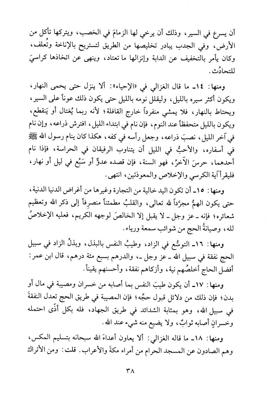 14 - ما قال الغزالي في "الإحياء": ألا ينزل حتى يحمى النهار، ويكون أكثر سيره بالليل، وليقلل نومه بالليل حتى يكون ذلك عوناً على السير، ويحتاط بالنهار، فلا يمشي منفرداً خارج القافلة؛ لأنه ربما يُغتال أو يَنقطع، ويكون بالليل متحفظاً عند النوم، فإن نام في ابتداء الليل، افترش ذراعه، وإن نام في آخر الليل، نصبَ ذراعه، وجعل رأسه في كفه، هكذا كان ينام رسول الله - صلى الله عليه وسلم - في أسفاره، والأحبُّ في الليل أن يتناوب الرفيقان في الحراسة، فإذا نام أحدهما، حرسَ الآخرُ، فهو السنة، فإن قصده عدوٌّ أو سَبُع في ليل أو نهار، فليقرأ آية الكرسي والإخلاص والمعوذتين، انتهى.
