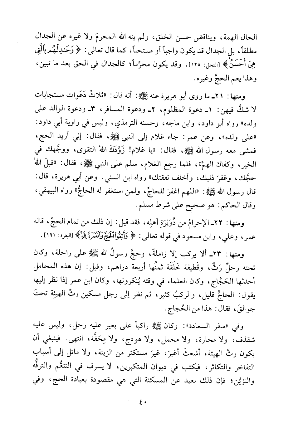 23 - ألا يركب إلا زاملةً، وحجَّ رسولُ الله - صلى الله عليه وسلم - على راحلة، وكان تحته رحلٌ رَثٌّ، وقَطيفة خَلَقَة ثمنُها أربعة دراهم، وقيل: إن هذه المحامل أحدثها الحَجَّاج، وكان العلماء في وقته يُنكرونها، وكان ابن عمر إذا نظر إليها يقول: الحاجُّ قليل، والركبُ كثير، ثم نظر إلى رجل مسكين رثِّ الهيئِة تحتَ جوالقَ، فقال: هذا من الحُجاج.