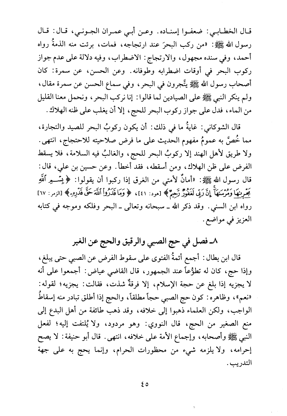 قال الخطابي: ضعفوا إسناده. وعن أبي عمران الجوني، قال: قال رسول الله - صلى الله عليه وسلم -: "من ركب البحرَ عند ارتجاجه، فمات، برئت منه الذمةُ رواه أحمد، وفي سنده مجهول، والارتجاج: الاضطراب، وفيه دلالة على عدم جواز ركوب البحر في أوقات اضطرابه وطوفانه. وعن الحسن، عن سمرة: كان أصحاب رسول الله - صلى الله عليه وسلم - يتَّجرون في البحر، وفي سماع الحسن عن سمرة مقال، ولم ينكر النبي - صلى الله عليه وسلم - على الصيادين لما قالوا: إنا نركب البحر، ونحمل معنا القليل من الماء، فدل على جواز ركوب البحر للحج، إلا أن يغلب على ظنه الهلاك.