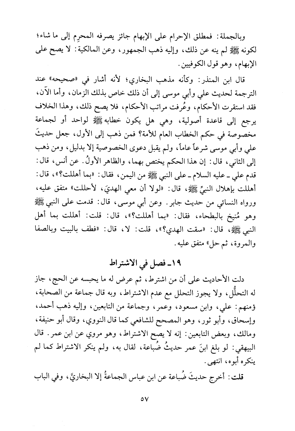 دلت الأحاديث على أن من اشترط، ثم عرض له ما يحبسه عن الحج، جاز له التحلُّل، ولا يجوز التحلل مع عدم الاشتراط، وبه قال جماعة من الصحابة، ومنهم: علي، وابن مسعود، وعمر، وجماعة من التابعين، وإليه ذهب أحمد، وإسحاق، وأبو ثور، وهو المصحح للشافعي كما قال النووي، وقال أبو حنيفة، ومالك، وبعض التابعين: إنه لا يصح الاشتراط، وهو مروي عن ابن عمر. قال البيهقي: لو بلغ ابنَ عمر حديثُ ضُباعة، لقال به، ولم ينكر الاشتراط كما لم ينكره أبوه، انتهى.