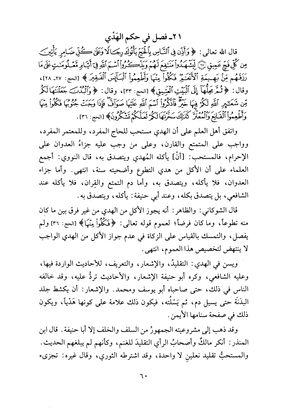 قال الله تعالى: {وَأَذِّنْ فِي النَّاسِ بِالْحَجِّ يَأْتُوكَ رِجَالًا وَعَلَى كُلِّ ضَامِرٍ يَأْتِينَ مِنْ كُلِّ فَجٍّ عَمِيقٍ (27) لِيَشْهَدُوا مَنَافِعَ لَهُمْ وَيَذْكُرُوا اسْمَ اللَّهِ فِي أَيَّامٍ مَعْلُومَاتٍ عَلَى مَا رَزَقَهُمْ مِنْ بَهِيمَةِ الْأَنْعَامِ فَكُلُوا مِنْهَا وَأَطْعِمُوا الْبَائِسَ الْفَقِيرَ} [الحج: 27 - 28] , وقال: {ثُمَّ مَحِلُّهَا إِلَى الْبَيْتِ الْعَتِيقِ} [الحج: 33] وقال: {وَالْبُدْنَ جَعَلْنَاهَا لَكُمْ مِنْ شَعَائِرِ اللَّهِ لَكُمْ فِيهَا خَيْرٌ فَاذْكُرُوا اسْمَ اللَّهِ عَلَيْهَا صَوَافَّ فَإِذَا وَجَبَتْ جُنُوبُهَا فَكُلُوا مِنْهَا وَأَطْعِمُوا الْقَانِعَ وَالْمُعْتَرَّ كَذَلِكَ سَخَّرْنَاهَا لَكُمْ لَعَلَّكُمْ تَشْكُرُونَ} [الحج: 36].