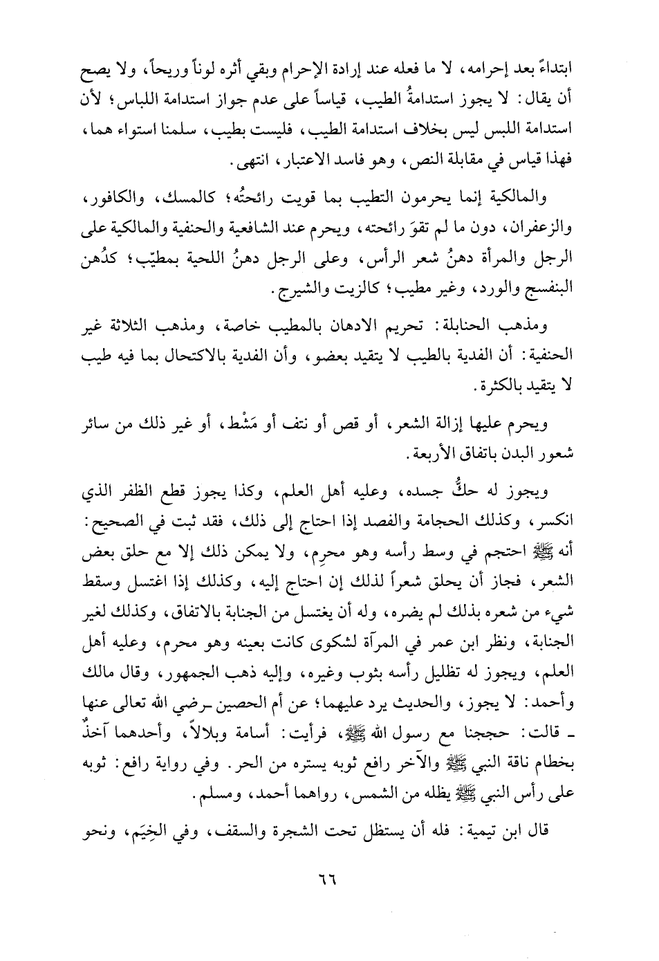 ويجوز له حكُّ جسده، وعليه أهل العلم، وكذا يجوز قطع الظفر الذي انكسر، وكذلك الحجامة والفصد إذا احتاج إلى ذلك، فقد ثبت في الصحيح: أنه - صلى الله عليه وسلم - احتجم في وسط رأسه وهو محرِم، ولا يمكن ذلك إلا مع حلق بعض الشعر، فجاز أن يحلق شعراً لذلك إن احتاج إليه، وكذلك إذا اغتسل وسقط شيء من شعره بذلك لم يضره، وله أن يغتسل من الجنابة بالاتفاق، وكذلك لغير الجنابة، ونظر ابن عمر في المرآة لشكوى كانت بعينه وهو محرم، وعليه أهل العلم، ويجوز له تظليل رأسه بثوب وغيره، وإليه ذهب الجمهور، وقال مالك وأحمد: لا يجوز، والحديث يرد عليهما؛ عن أم الحصين -رضي الله تعالى عنها- قالت: حججنا مع رسول الله - صلى الله عليه وسلم -، فرأيت: أسامة وبلالاً، وأحدهما آخذٌ بخطام ناقة النبي - صلى الله عليه وسلم - والآخر رافع ثوبه يستره من الحر. وفي رواية رافع: ثوبه على رأس النبي - صلى الله عليه وسلم - يظله من الشمس، رواهما أحمد، ومسلم.