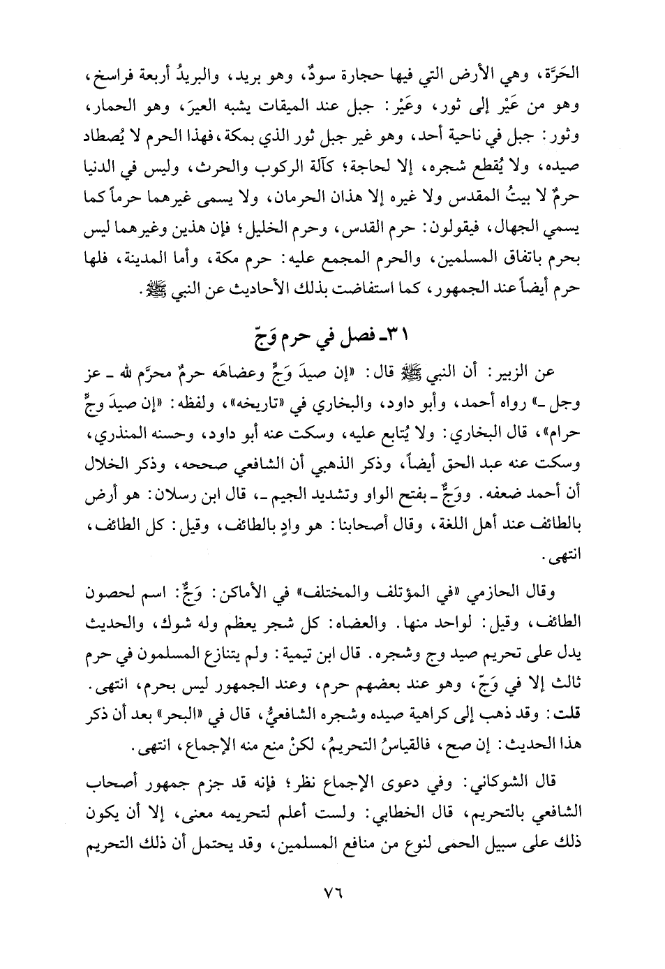عن الزبير: أن النبي - صلى الله عليه وسلم - قال: "إن صيدَ وَجٍّ وعضاهَه حرمٌ محرَّم لله -عز وجل-" رواه أحمد، وأبو داود، والبخاري في "تاريخه"، ولفظه: "إن صيدَ وجٍّ حرام"، قال البخاري: ولا يُتابع عليه، وسكت عنه أبو داود، وحسنه المنذري، وسكت عنه عبد الحق أيضاً، وذكر الذهبي أن الشافعي صححه، وذكر الخلال أن أحمد ضعفه. ووَجٌّ -بفتح الواو وتشديد الجيم-، قال ابن رسلان: هو أرض بالطائف عند أهل اللغة، وقال أصحابنا: هو وادٍ بالطائف، وقيل: كل الطائف، انتهى.
