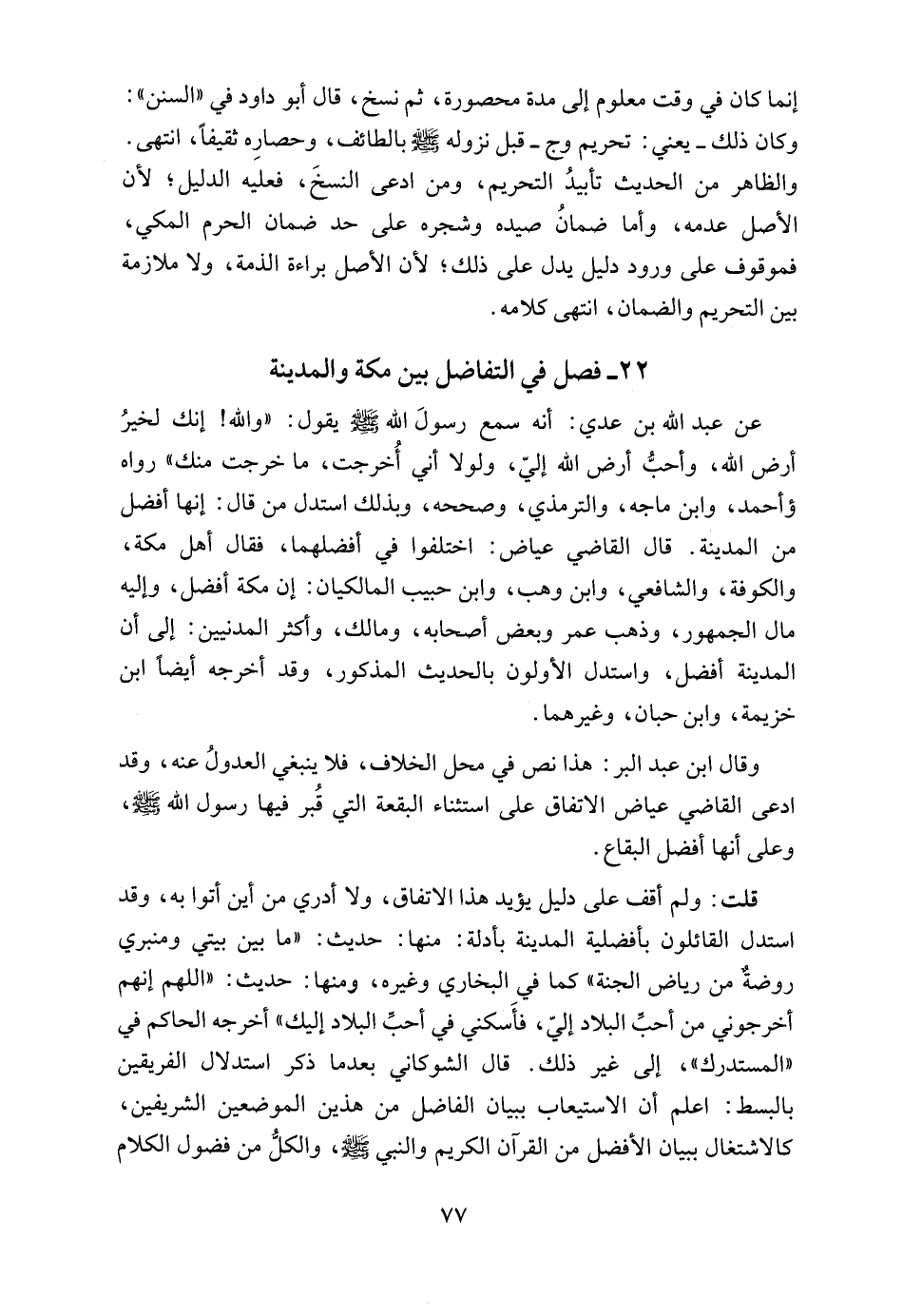 قلت: ولم أقف على دليل يؤيد هذا الاتفاق، ولا أدري من أين أتوا به، وقد استدل القائلون بأفضلية المدينة بأدلة: منها: حديث: "ما بين بيتي ومنبري روضةٌ من رياض الجنة" كما في البخاري وغيره، ومنها: حديث: "اللهم إنهم أخرجوني من أحبِّ البلاد إليّ، فأَسكني في أحبِّ البلاد إليك" أخرجه الحاكم في "المستدرك"، إلى غير ذلك. قال الشوكاني بعدما ذكر استدلال الفريقين بالبسط: اعلم أن الاستيعاب ببيان الفاضل من هذين الموضعين الشريفين، كالاشتغال ببيان الأفضل من القرآن الكريم والنبي - صلى الله عليه وسلم -، والكلُّ من فضول الكلام