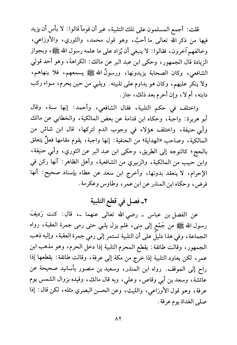 قلت: أجمع المسلمون على تلك التلبية، غير أن قوماً قالوا: لا بأس أن يزيد فيها من ذكر الله تعالى ما أحبَّ، وهو قول محمد، والثوري، والأوزاعي، وخالفهم آخرون، فقالوا: لا ينبغي أن يُزاد على ما علمه رسول الله - صلى الله عليه وسلم -، وبجواز الزيادة قال الجمهور، وحكى ابن عبد البر عن مالك: الكراهةَ، وهو أحد قولي الشافعي، وكان الصحابة يزيدونها، ورسولُ الله - صلى الله عليه وسلم - يسمعهم، فلا ينهاهم، ولا ينكر عليهم، وكان هو يداوم على تلبيته. ويلبي من حين يحرم، سواء ركب دابته، أم لا، وإن أحرم بعد ذلك، جاز.