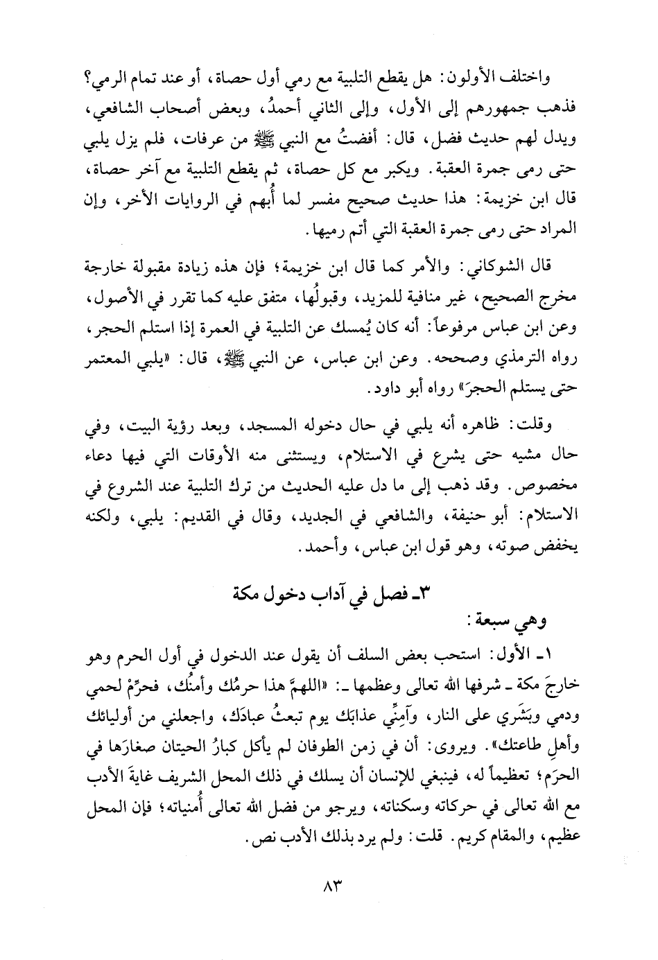 قال الشوكاني: والأمر كما قال ابن خزيمة؛ فإن هذه زيادة مقبولة خارجة مخرج الصحيح، غير منافية للمزيد، وقبولُها، متفق عليه كما تقرر في الأصول، وعن ابن عباس مرفوعاً: أنه كان يُمسك عن التلبية في العمرة إذا استلم الحجر، رواه الترمذي وصححه. وعن ابن عباس، عن النبي - صلى الله عليه وسلم -، قال: "يلبي المعتمر حتى يستلم الحجرَ" رواه أبو داود.