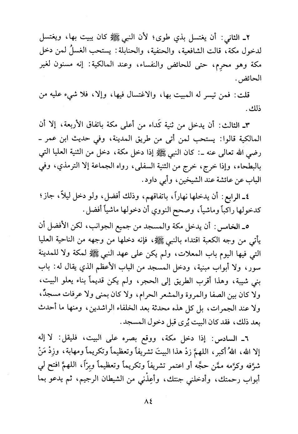 5 - الخامس: أن يدخل مكة والمسجد من جميع الجوانب، لكن الأفضل أن يأتي من وجه الكعبة اقتداء بالنبي - صلى الله عليه وسلم -، فإنه دخلها من وجهه من الناحية العليا التي فيها اليوم باب المعلات، ولم يكن على عهد النبي - صلى الله عليه وسلم - لمكة ولا للمدينة سور، ولا أبواب مبنية، ودخل المسجد من الباب الأعظم الذي يقال له: باب بني شيبة، وهذا أقرب الطريق إلى الحجر، ولم يكن قديماً بناء يعلو البيت، ولا كان بين الصفا والمروة والمشعر الحرام، ولا كان بمنى ولا عرفات مسجدٌ، ولا عند الجمرات، بل كل هذه محدثة بعد الخلفاء الراشدين، ومنها ما أحدث بعد ذلك، فقد كان البيت يُرى قبل دخول المسجد.