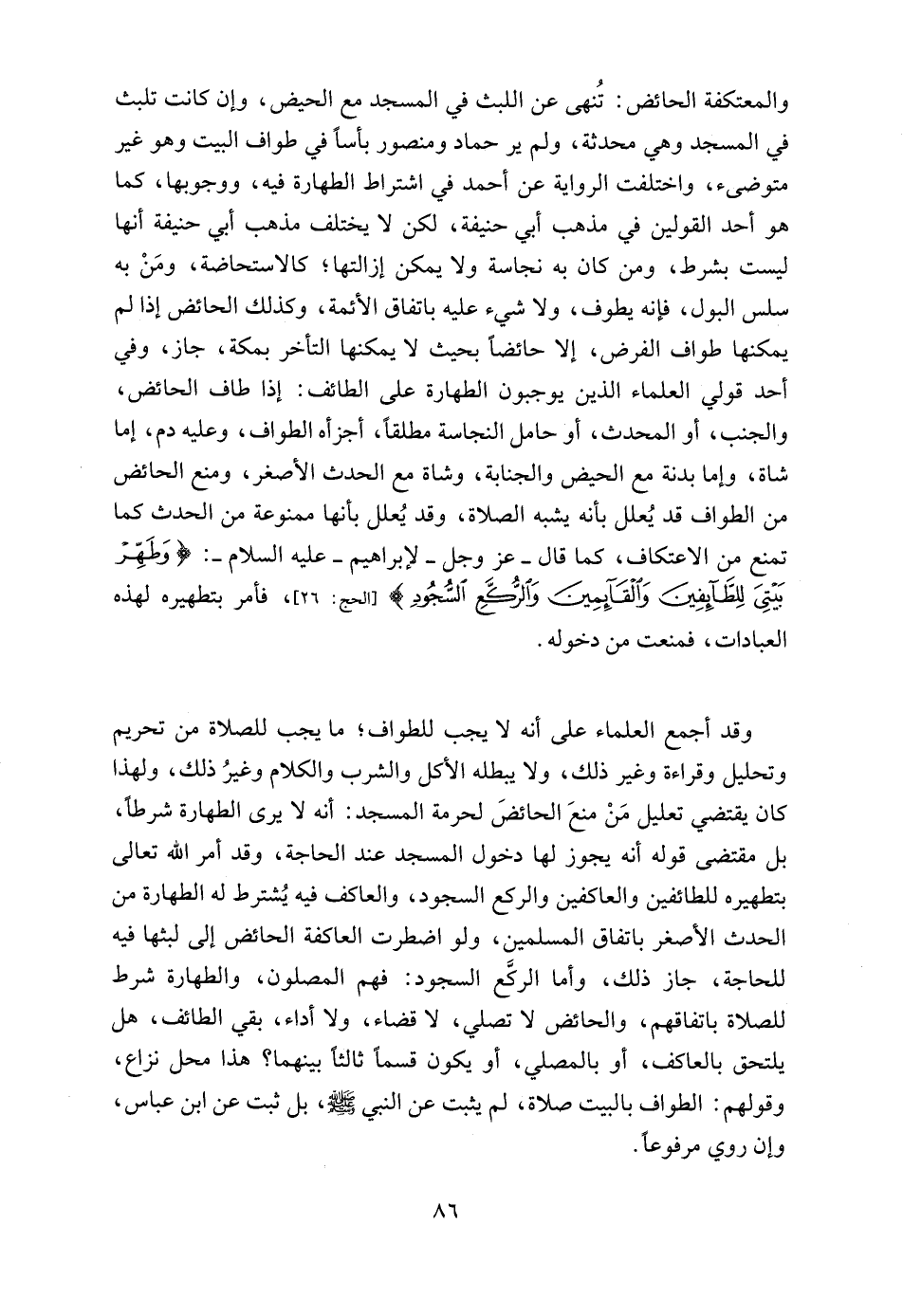 وقد أجمع العلماء على أنه لا يجب للطواف؛ ما يجب للصلاة من تحريم وتحليل وقراءة وغير ذلك، ولا يبطله الأكل والشرب والكلام وغيرُ ذلك، ولهذا كان يقتضي تعليل مَنْ منعَ الحائضَ لحرمة المسجد: أنه لا يرى الطهارة شرطاً، بل مقتضى قوله أنه يجوز لها دخول المسجد عند الحاجة، وقد أمر الله تعالى بتطهيره للطائفين والعاكفين والركع السجود، والعاكف فيه يُشترط له الطهارة من الحدث الأصغر باتفاق المسلمين، ولو اضطرت العاكفة الحائض إلى لبثها فيه للحاجة، جاز ذلك، وأما الركَّع السجود: فهم المصلون، والطهارة شرط للصلاة باتفاقهم، والحائض لا تصلي، لا قضاء، ولا أداء، بقي الطائف، هل يلتحق بالعاكف، أو بالمصلي، أو يكون قسماً ثالثاً بينهما؟ هذا محل نزاع، وقولهم: الطواف بالبيت صلاة، لم يثبت عن النبي - صلى الله عليه وسلم -، بل ثبت عن ابن عباس، وإن روي مرفوعاً.
