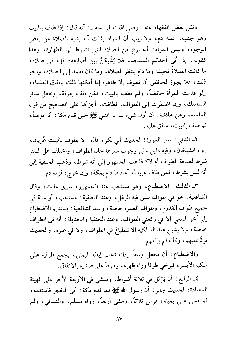 3 - الثالث: الاضطباع، وهو مستحب عند الجمهور، سوى مالك، وقال الشافعية: هو في طواف ليس فيه الرمَل، وعند الحنفية: مستحب، أو سنة في جميع طواف القدوم، وطواف العمرة خاصة، وعند الشافعية: يستديم الاضطباع إلى آخر السعي إلا في ركعتي الطواف، وعند الحنفية والحنابلة: أنه في الطواف خاصة، ولا يشرع عند المالكية الاضطباعُ في الطواف، ولا في غيره، والحديث يردُّ عليهم، وكأنه لم يبلغهم.