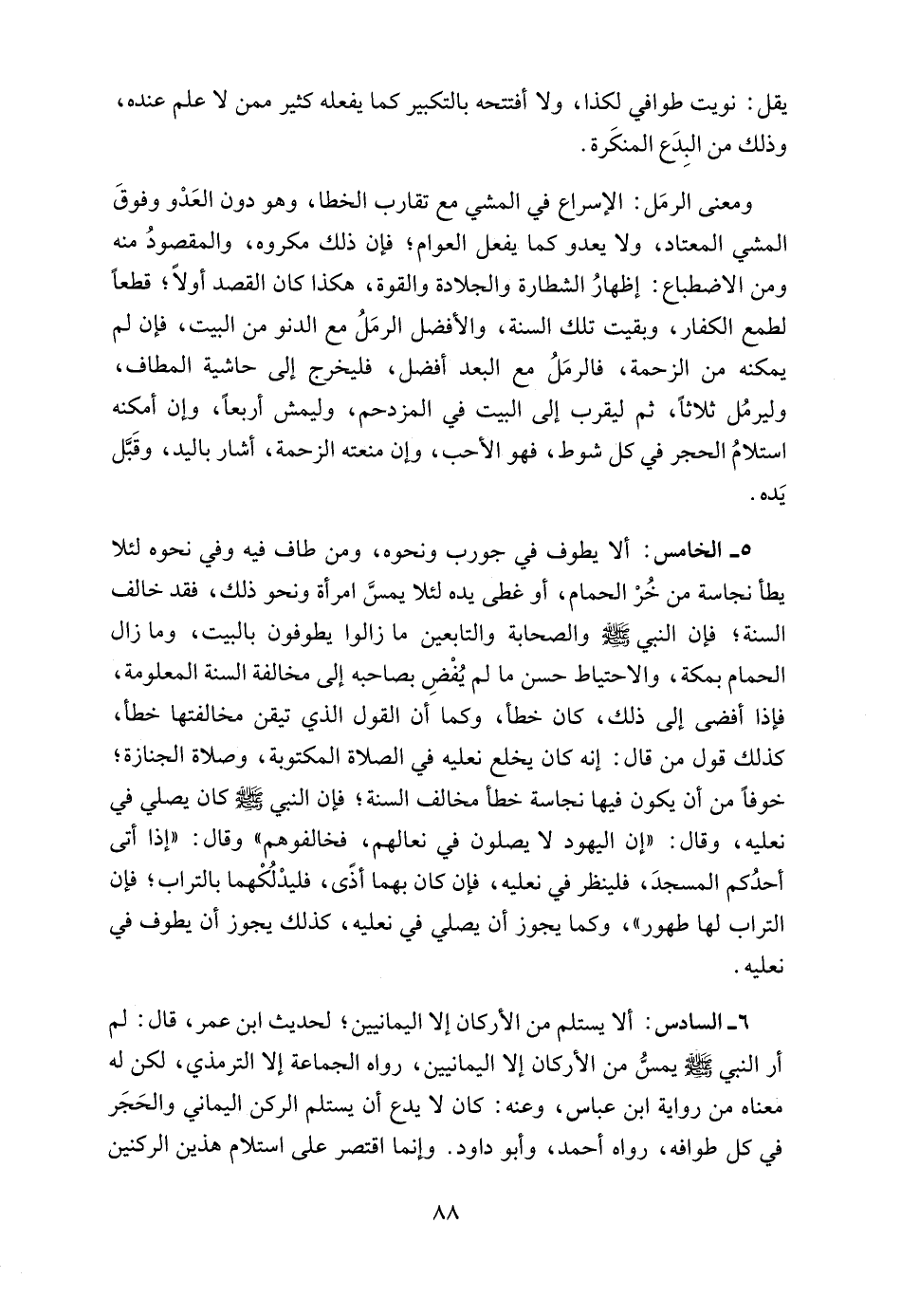 5 - الخامس: ألا يطوف في جورب ونحوه، ومن طاف فيه وفي نحوه لئلا يطأ نجاسة من خُرْ الحمام، أو غطى يده لئلا يمسَّ امرأة ونحو ذلك، فقد خالف السنة؛ فإن النبي - صلى الله عليه وسلم - والصحابة والتابعين ما زالوا يطوفون بالبيت، وما زال الحمام بمكة، والاحتياط حسن ما لم يُفْضِ بصاحبه إلى مخالفة السنة المعلومة، فإذا أفضى إلى ذلك، كان خطأ، وكما أن القول الذي تيقن مخالفتها خطأ، كذلك قول من قال: إنه كان يخلع نعليه في الصلاة المكتوبة، وصلاة الجنازة؛ خوفاً من أن يكون فيها نجاسة خطأ مخالف السنة؛ فإن النبي - صلى الله عليه وسلم - كان يصلي في نعليه، وقال: "إن اليهود لا يصلون في نعالهم، فخالفوهم" وقال: "إذا أتى أحدُكم المسجدَ، فلينظر في نعليه، فإن كان بهما أذًى، فليدْلُكْهما بالتراب؛ فإن التراب لها طهور"، وكما يجوز أن يصلي في نعليه، كذلك يجوز أن يطوف في نعليه.
