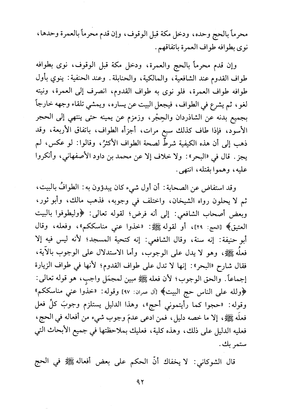 وقد استفاض عن الصحابة: أن أول شيء كان يبدؤون به: الطوافُ بالبيت، ثم لا يحلون رواه الشيخان، واختلف في وجوبه، فذهب مالك، وأبو ثور، وبعض أصحاب الشافعي: إلى أنه فرض؛ لقوله تعالى: {وَلْيَطَّوَّفُوا بِالْبَيْتِ الْعَتِيقِ} [الحج: 29]، أو لقوله - صلى الله عليه وسلم -: "خذوا عني مناسككم"، وفعله، وقال أبو حنيفة: إنه سنة، وقال الشافعي: إنه كتحية المسجد؛ لأنه ليس فيه إلا فعلُه - صلى الله عليه وسلم -، وهو لا يدل على الوجوب، وأما الاستدلال على الوجوب بالآية، فقال شارح "البحر": إنها لا تدل على طواف القدوم؛ لأنها في طواف الزيارة إجماعاً. والحق الوجوب؛ لأن فعله - صلى الله عليه وسلم - مبين لمجمَل واجبٍ، هو قوله تعالى: {وَلِلَّهِ عَلَى النَّاسِ حِجُّ الْبَيْتِ} [آل عمران: 97] وقوله: "خذوا عني مناسككم" وقوله: "حجوا كما رأيتموني أحج"، وهذا الدليل يستلزم وجوبَ كلِّ فعل فعلَه - صلى الله عليه وسلم -، إلا ما خصه دليل، فمن ادعى عدمَ وجوب شيء من أفعاله في الحج، فعليه الدليل على ذلك، وهذه كلية، فعليك بملاحظتها في جميع الأبحاث التي ستمر بك.