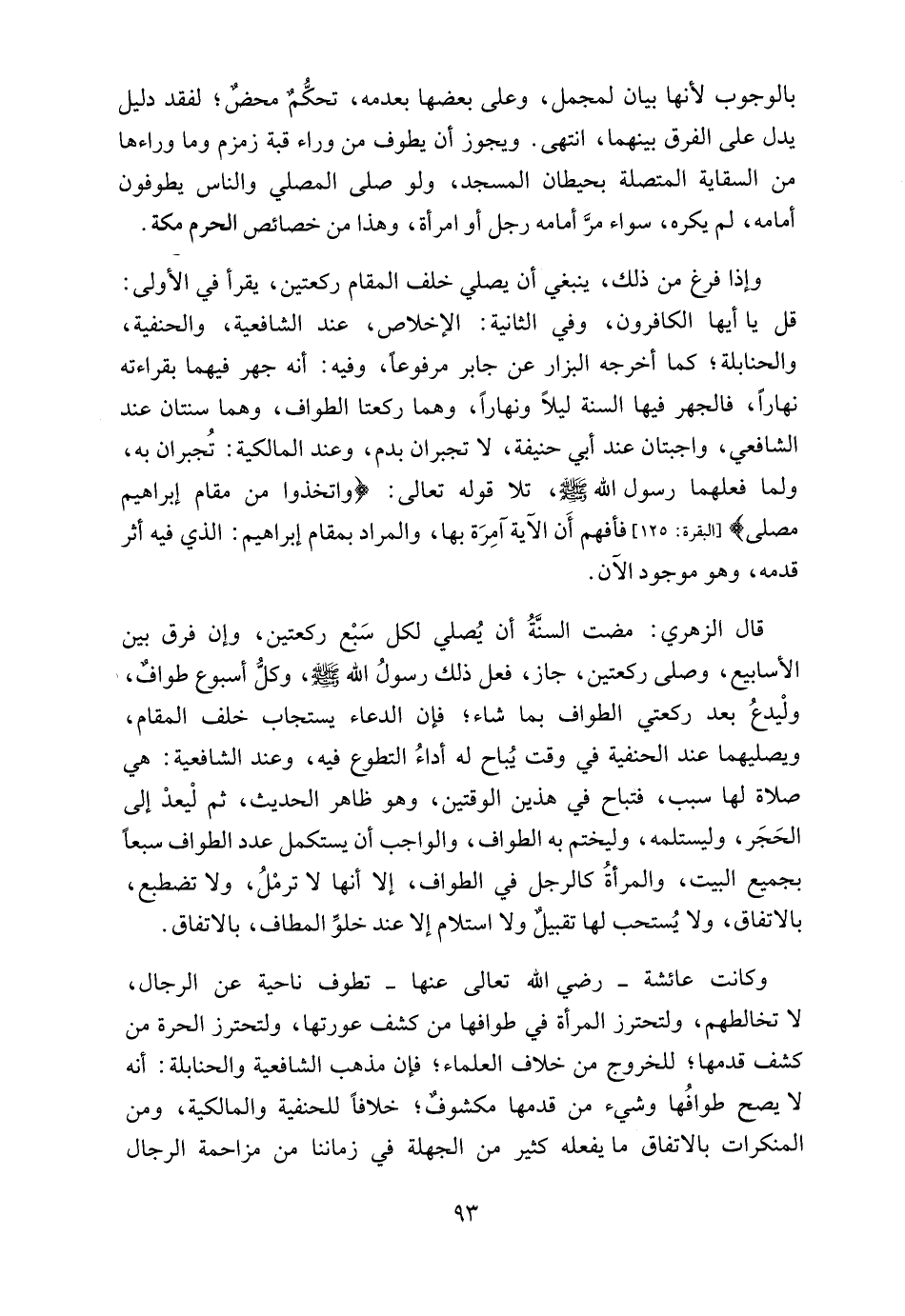 وإذا فرغ من ذلك، ينبغي أن يصلي خلف المقام ركعتين، يقرأ في الأولى: قل يا أيها الكافرون، وفي الثانية: الإخلاص، عند الشافعية، والحنفية، والحنابلة؛ كما أخرجه البزار عن جابر مرفوعاً، وفيه: أنه جهر فيهما بقراءته نهاراً، فالجهر فيها السنة ليلاً ونهاراً، وهما ركعتا الطواف، وهما سنتان عند الشافعي، واجبتان عند أبي حنيفة، لا تجبران بدم، وعند المالكية: تُجبران به، ولما فعلهما رسول الله - صلى الله عليه وسلم -، تلا قوله تعالى: {وَاتَّخِذُوا مِنْ مَقَامِ إِبْرَاهِيمَ مُصَلًّى} [البقرة: 125] فأفهم أَن الآية آمِرَة بها، والمراد بمقام إبراهيم: الذي فيه أثر قدمه، وهو موجود الآن.