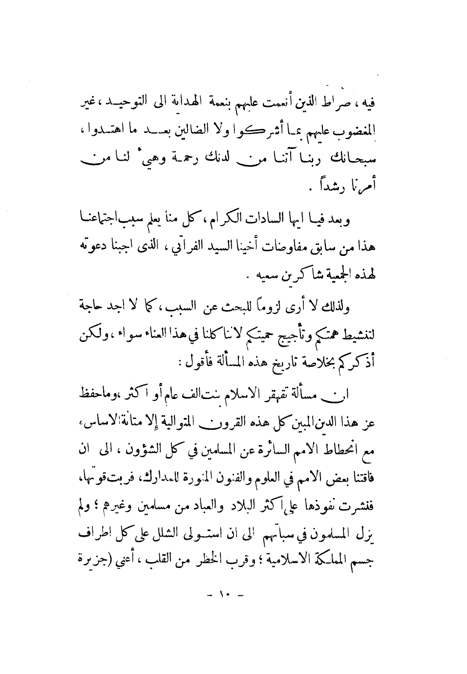 إِن مَسْأَلَة تقهقر الْإِسْلَام بنت ألف عَام أَو أَكثر، وَمَا حفظ عز هَذَا الدّين الْمُبين كل هَذِه الْقُرُون المتوالية إِلَّا متانة الأساس، مَعَ انحطاط الْأُمَم السائرة عَن الْمُسلمين فِي كل الشؤون، إِلَى أَن فاقتنا بعض الْأُمَم فِي الْعُلُوم والفنون المنورة للمدارك، فربت قوتها، فنشرت نفوذها على أَكثر الْبِلَاد والعباد من مُسلمين وَغَيرهم؛ وَلم يزل الْمُسلمُونَ فِي سباتهم إِلَى أَن استولى الشلل على كل أَطْرَاف جسم المملكة الإسلامية؛ وَقرب الْخطر من الْقلب، اعني (جَزِيرَة