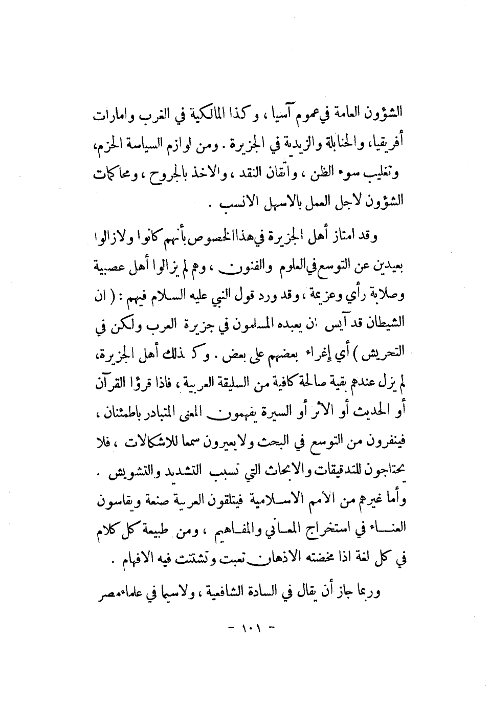 وَقد امتاز أهل الجزيرة فِي هَذَا الْخُصُوص بِأَنَّهُم كَانُوا وَلَا زَالُوا بعيدين عَن التَّوَسُّع فِي الْعُلُوم والفنون، وهم لم يزَالُوا أهل عصبية وصلابة رَأْي وعزيمة، وَقد ورد قَول النَّبِي عَلَيْهِ السَّلَام فيهم: (إِن الشَّيْطَان قد آيس إِن يعبده الْمُسلمُونَ فِي جَزِيرَة الْعَرَب وَلَكِن فِي التحريش) أَي إغراء بَعضهم على بعض. وَكَذَلِكَ أهل الجزيرة، لم يزل عِنْدهم بَقِيَّة صَالِحَة كَافِيَة من السليقة الْعَرَبيَّة، فَإِذا قرؤوا الْقُرْآن أَو الحَدِيث أَو الْأَثر أَو السِّيرَة يفهمون الْمَعْنى الْمُتَبَادر باطمئنان، فينفرون من التَّوَسُّع فِي الْبَحْث وَلَا يعيرون سمعا للإشكالات، فَلَا يَحْتَاجُونَ للتدقيقات والأبحاث الَّتِي تسبب التَّشْدِيد والتشويش. وَأما غَيرهم من الْأُمَم الإسلامية فيتلقون الْعَرَبيَّة صَنْعَة ويقاسون العناء فِي اسْتِخْرَاج الْمعَانِي والمفاهيم، وَمن طبيعة كل كَلَام فِي كل لُغَة إِذا مخضته الأذهان تعبت وتشتتت فِيهِ الأفهام.