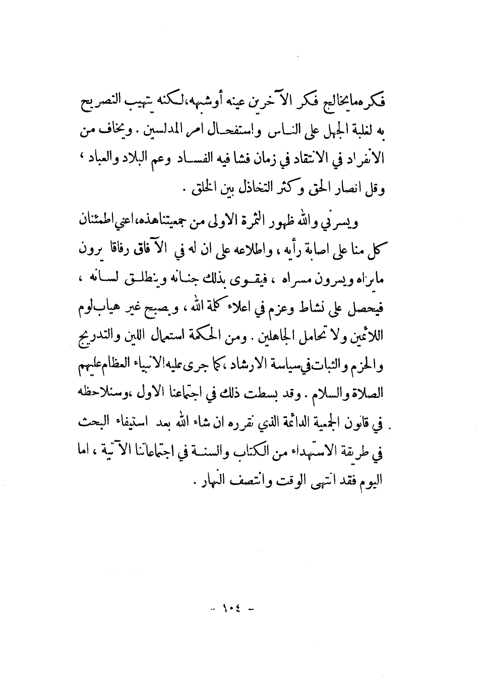 ويسرني وَالله ظُهُور الثَّمَرَة الأولى من جمعيتنا هَذِه، أَعنِي اطمئنان كل منا على إِصَابَة رَأْيه، وإطلاعه على أَن لَهُ فِي الْآفَاق رفاقا يرَوْنَ مَا يرَاهُ ويسرون مسراه، فيقوى بذلك جنانه وينطلق لسانة، فَيحصل على نشاط وعزم فِي إعلاء كلمة الله، وَيُصْبِح غير هياب لوم اللائمين وَلَا تحامل الْجَاهِلين. وَمن الْحِكْمَة اسْتِعْمَال اللين والتدريج والحزم والثبات فِي سياسة الْإِرْشَاد، كَمَا جرى عَلَيْهِ الْأَنْبِيَاء الْعِظَام عَلَيْهِم الصَّلَاة وَالسَّلَام. وَقد بسطت ذَلِك فِي اجتماعنا الأول، وسنلاحظه فِي قانون الجمعية الدائمة الَّذِي نقرره إِن شَاءَ الله بعد اسْتِيفَاء الْبَحْث فِي طَرِيقه الاستهداء من الْكتاب وَالسّنة فِي اجتماعاتنا الْآتِيَة، أما الْيَوْم فقد انْتهى الْوَقْت وانتصف النَّهَار.