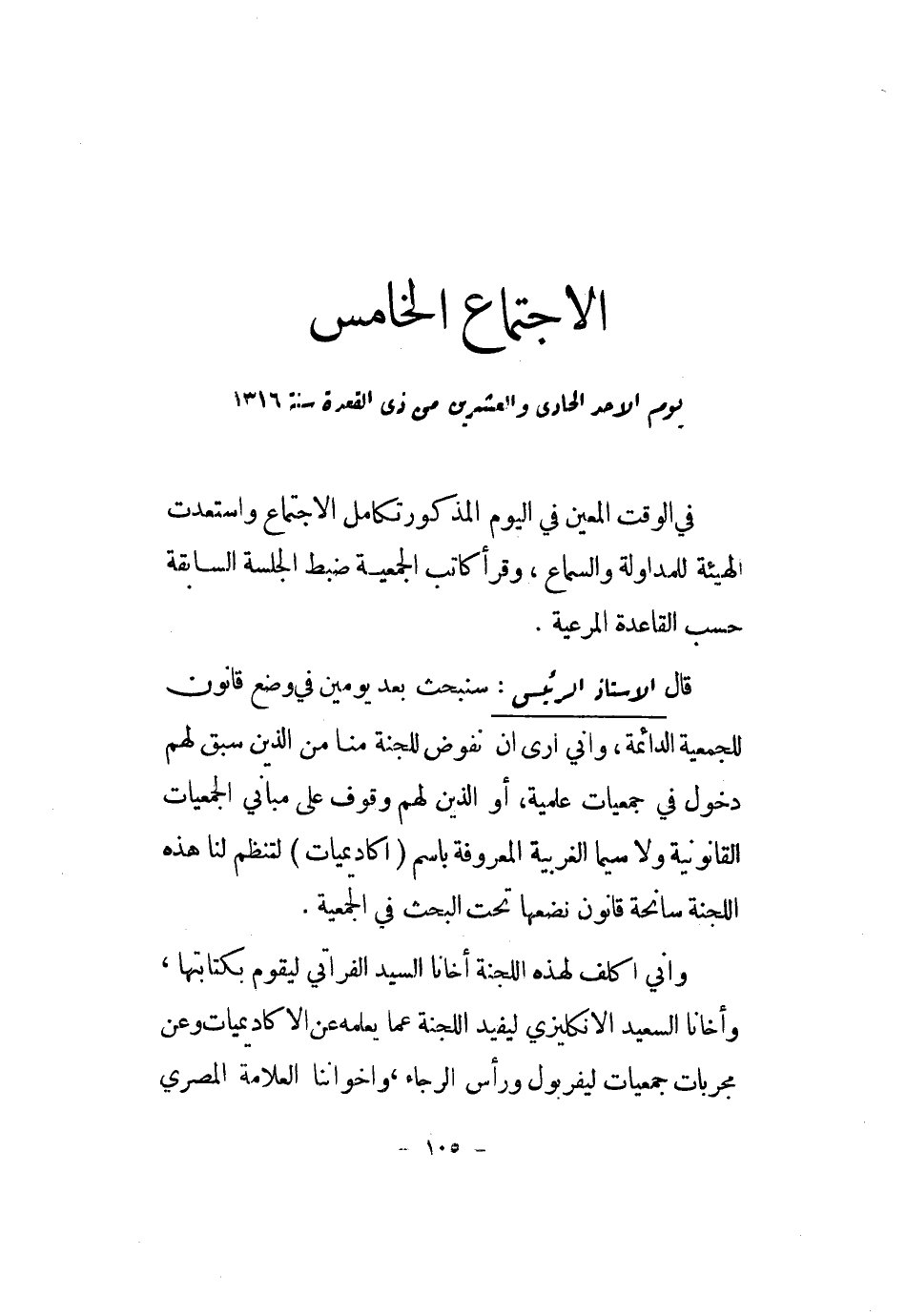 وَإِنِّي أكلف لهَذِهِ اللجنة أخانا السَّيِّد الفراتي ليقوم بكتابتها، وأخانا السعيد الإنكليزي ليُفِيد اللجنة عَمَّا يُعلمهُ عَن الأكاديميات وَعَن مجربات جمعيات ليفر بَوْل وَرَأس الرَّجَاء، وإخواننا الْعَلامَة الْمصْرِيّ