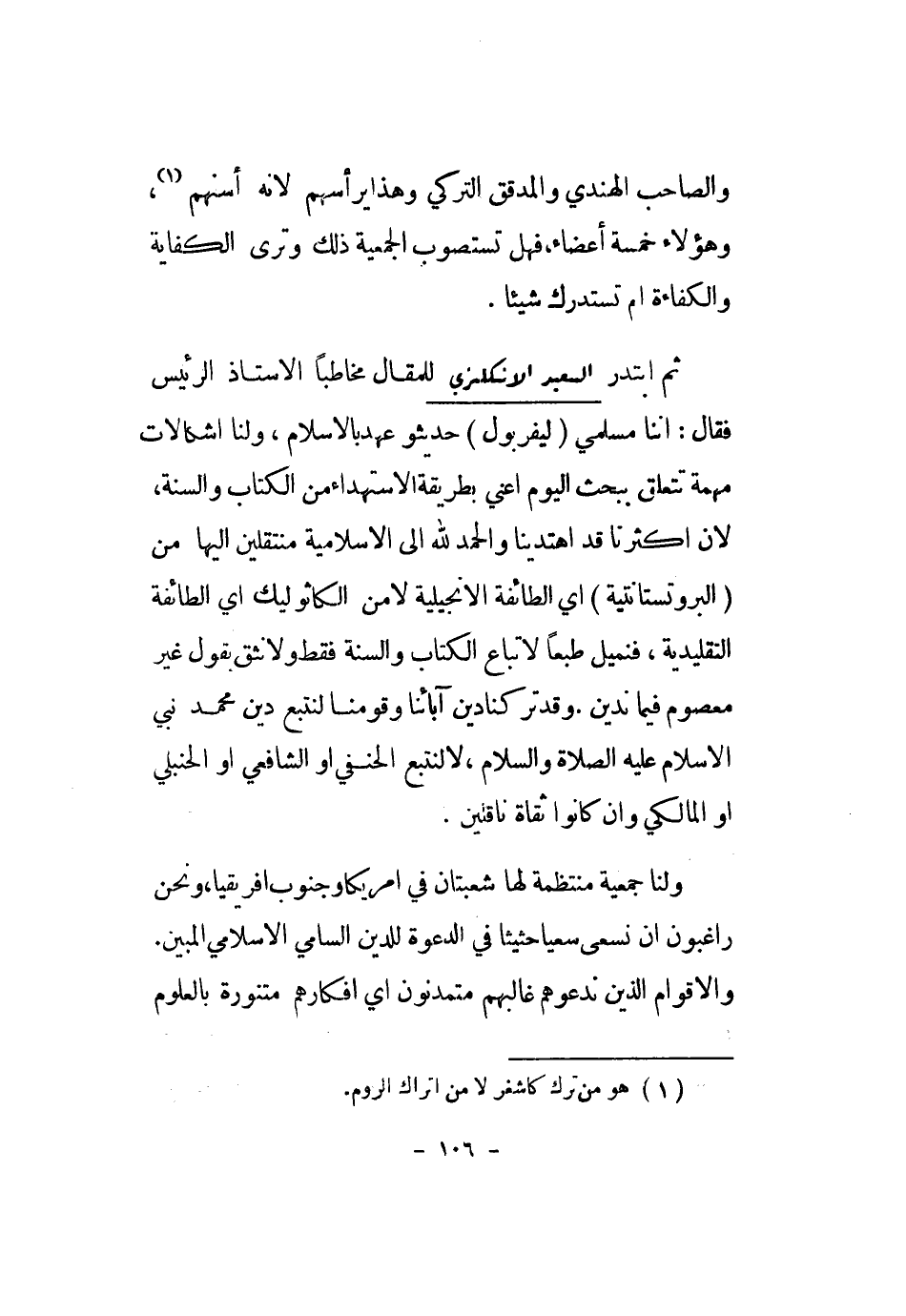 ثمَّ ابتدر السعيد الإنكليزي: للمقال مُخَاطبا الْأُسْتَاذ الرئيس فَقَالَ: أننا مُسْلِمِي (ليفربول) حديثو عهد بِالْإِسْلَامِ، وَلنَا إشكالات مهمة تتَعَلَّق ببحث الْيَوْم أَعنِي بطريقة الاستهداء من الْكتاب وَالسّنة، لِأَن أكثرنا قد اهتدينا وَالْحَمْد لله إِلَى الإسلامية منتقلين إِلَيْهَا من (البروتستانتية) أَي الطَّائِفَة الإنجيلية لأمن الكاثوليك أَي الطَّائِفَة التقليدية، فنميل طبعا لإتباع الْكتاب وَالسّنة فَقَط وَلَا نثق بقول غير مَعْصُوم فِيمَا ندين، وَقد تركنَا دين آبَائِنَا وقومنا لنتبع دين مُحَمَّد نَبِي الْإِسْلَام [صلى الله عَلَيْهِ وَسلم] ، لَا لنتبع الْحَنَفِيّ أَو الشَّافِعِي أَو الْحَنْبَلِيّ أَو الْمَالِكِي وَإِن كَانُوا ثقاة ناقلين.