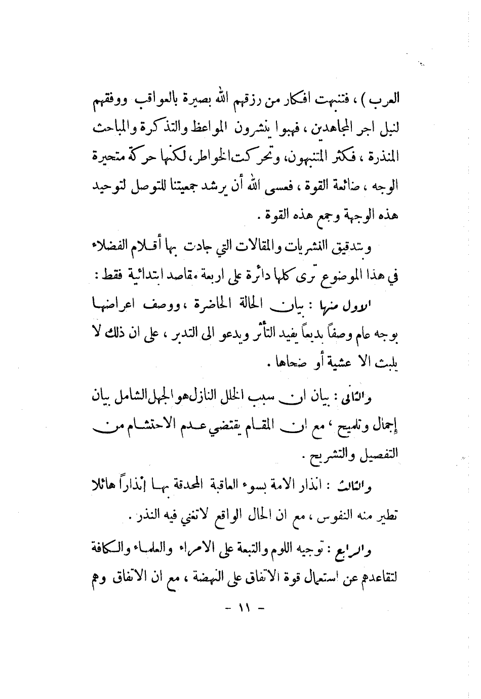 الْعَرَب) ، فتنبهت أفكار من رزقهم الله بَصِيرَة بالعواقب ووفقهم لنيل أجر الْمُجَاهدين، فهبوا ينشرون المواعظ والتذكرة والمباحث المنذرة، فَكثر المتنبهون، وتحركت الخواطر، لَكِنَّهَا حَرَكَة متحيرة الْوَجْه، ضائعة الْقُوَّة، فَعَسَى الله أَن يرشد جمعيتنا للتوصل لتوحيد هَذِه الوجهة وَجمع هَذِه الْقُوَّة.