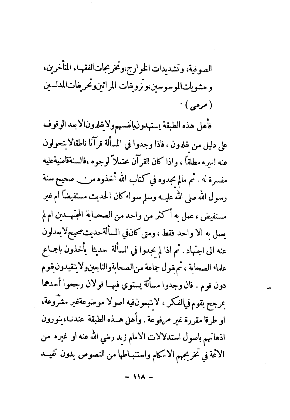 فَأهل هَذِه الطَّبَقَة يستهدون بِأَنْفسِهِم وَلَا يقلدون إِلَّا بعد الْوُقُوف على دَلِيل من يقلدون، فَإِذا وجدوا فِي الْمَسْأَلَة قُرْآنًا ناطقاً لَا يتحولون عَنهُ لغيره مُطلقًا، وَإِذا كَانَ الْقُرْآن مُحْتملا لوجوه، فَالسنة قاضية عَلَيْهِ مفسرة لَهُ ثمَّ مَا لم يجدوه فِي كتاب الله أَخَذُوهُ من صَحِيح سنة رَسُول [صلى الله عَلَيْهِ وَسلم] سَوَاء كَانَ الحَدِيث مستفيضاً أم غير مستفيض، عمل بِهِ اكثر من وَاحِد من الصَّحَابَة الْمُجْتَهدين أم لم يعْمل بِهِ إِلَّا وَاحِد فَقَط، وَمَتى كَانَ فِي الْمَسْأَلَة حَدِيث صَحِيح لَا يعدلُونَ عَنهُ إِلَى اجْتِهَاد. ثمَّ إِذا لم يَجدوا فِي الْمَسْأَلَة حَدِيثا يَأْخُذُونَ بِإِجْمَاع عُلَمَاء الصَّحَابَة، ثمَّ بقول جمَاعَة من الصَّحَابَة وَالتَّابِعِينَ وَلَا يتقيدون بِقوم دون قوم. فَإِن وجدوا مَسْأَلَة يَسْتَوِي فِيهَا قَولَانِ رجحوا أَحدهمَا بمرجح يقوم فِي الْفِكر، لَا يتبعُون فِيهِ أصولاً مَوْضُوعَة غير مَشْرُوعَة، أَو طرقاً مقررة غير مَرْفُوعَة. وَأهل هَذِه الطَّبَقَة عندنَا، ينورون أذهانهم بأصول استدلالات الإِمَام زيد رَضِي الله عَنهُ أَو غَيره من الْأَئِمَّة تخريجهم الْأَحْكَام واستنباطها من النُّصُوص بِدُونِ تقيد