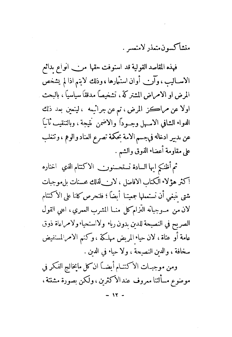 ثمَّ أظنكم أَيهَا السَّادة تستحسنون الاكتتام الَّذِي اخْتَارَهُ أَكثر هَؤُلَاءِ الْكتاب الأفاضل، لِأَن لذَلِك محسنات بل مُوجبَات شَتَّى يَنْبَغِي أَن تستعملها جمعيتنا أَيْضا؛ فلنحرص كلنا على الاكتتام لِأَن من موجباته الْتِزَام كل منا المشرب الْعمريّ، أَعنِي القَوْل الصَّرِيح فِي النَّصِيحَة للدّين بِدُونِ رِيَاء وَلَا استحياء وَلَا مُرَاعَاة ذوق عَامَّة أَو عتاة، لِأَن حَيَاء الْمَرِيض مهلكة، وكتم الْأَمر المستفيض سخافة، وَالدّين النَّصِيحَة، وَلَا حَيَاء فِي الدّين.