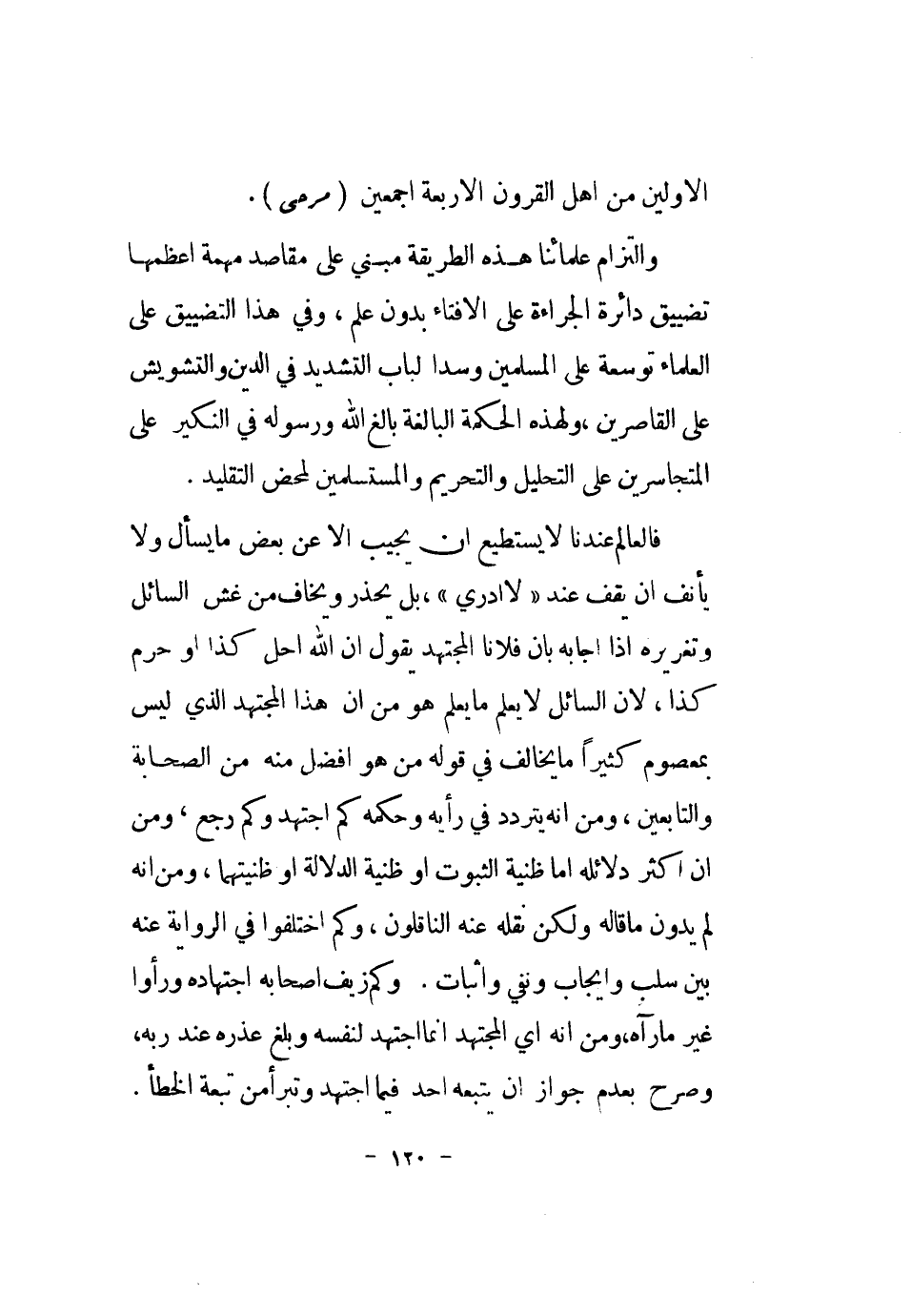 فالعالم عندنَا لَا يَسْتَطِيع أَن يُجيب إِلَّا عَن بعض مَا يسْأَل وَلَا يأنف أَن يقف عِنْد " لَا أَدْرِي "، بل يحذر وَيخَاف من غش السَّائِل وتغريره إِذا إِجَابَة بِأَن فلَانا الْمُجْتَهد يَقُول أَن الله أحل كَذَا وَحرم كَذَا، لِأَن السَّائِل لَا يعلم مَا يعلم هُوَ من أَن هَذَا الْمُجْتَهد الَّذِي لَيْسَ بمعصوم كثيرا مَا يُخَالف فِي قَوْله من هُوَ أفضل مِنْهُ من الصَّحَابَة وَالتَّابِعِينَ، وَمن أَنه يتَرَدَّد فِي رَأْيه وَحكمه كم إجتهد وَكم رَجَعَ، وَمن أَن أَكثر دلائله أما ظنية الثُّبُوت أَو ظنية الدّلَالَة أَو ظنيتهما، وَمن أَنه لم يدون مَا قَالَه وَلَكِن نَقله عَنهُ الناقلون، وَكم اخْتلفُوا فِي الرِّوَايَة عَنهُ بَين سلب وَإِيجَاب وَنفي وَإِثْبَات. وَكم زيف أَصْحَابه اجْتِهَاده وَرَأَوا غير مَا رَآهُ، وَمن أَنه أَي الْمُجْتَهد إِنَّمَا اجْتهد لنَفسِهِ وَبلغ عذره عِنْد ربه، وَصرح بِعَدَمِ جَوَاز أَن يتبعهُ أحد فِيمَا أجتهد وتبرأ من تبعه الْخَطَأ.
