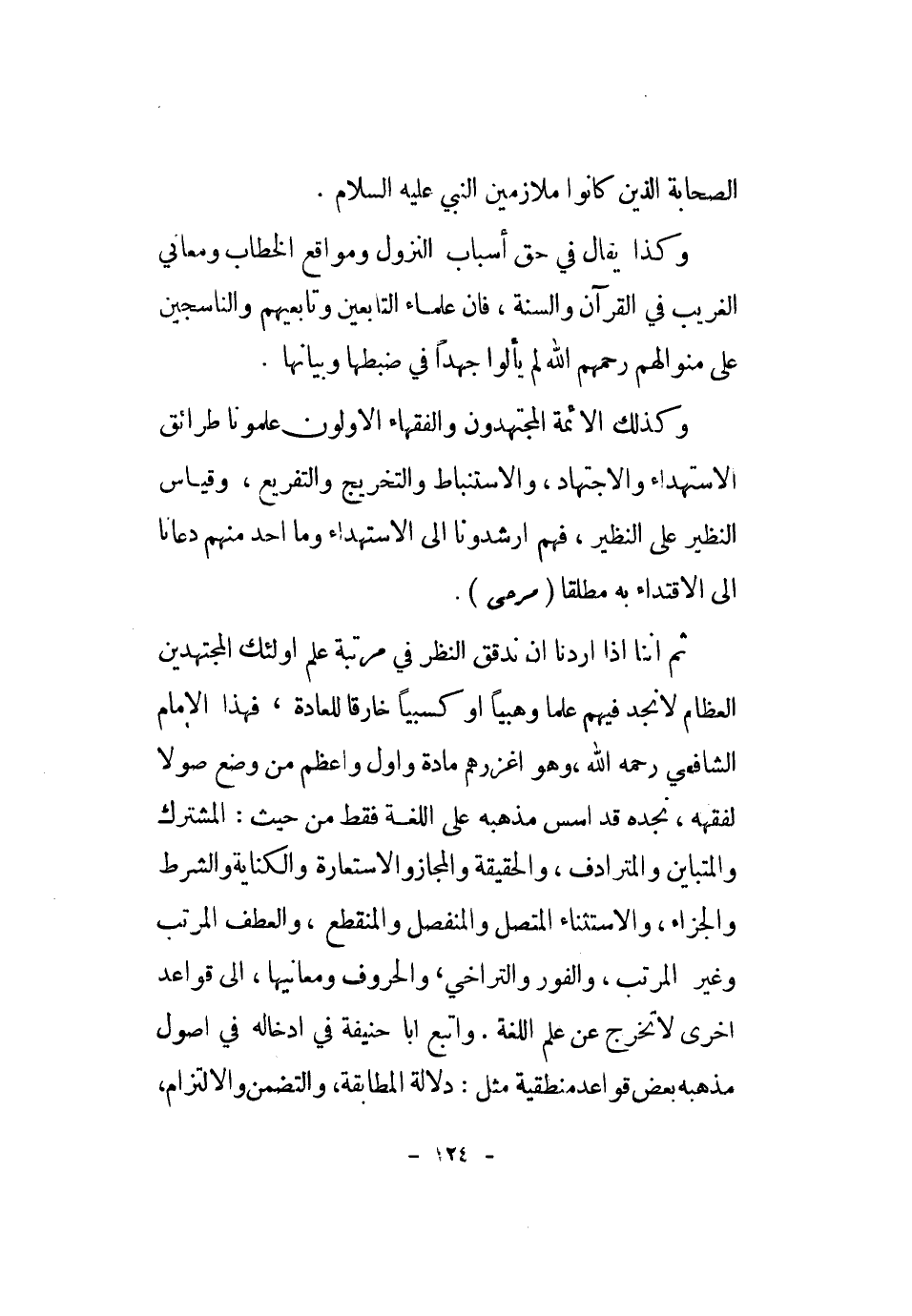 ثمَّ أننا إِذا أردنَا أَن ندقق النّظر فِي مرتبَة علم أُولَئِكَ الْمُجْتَهدين الْعِظَام لَا نجد فيهم علما وهبياً أَو كسبياً خارقا للْعَادَة، فَهَذَا الإِمَام الشَّافِعِي رَحمَه الله، وَهُوَ اغزرهم مَادَّة وَأول وَأعظم من وضع صولا لفقهه، نجده قد أسس مذْهبه على اللُّغَة فَقَط من حَيْثُ: الْمُشْتَرك والمتباين والمترادف، والحقيقة وَالْمجَاز والاستعارة وَالْكِنَايَة وَالشّرط وَالْجَزَاء، وَالِاسْتِثْنَاء الْمُتَّصِل والمنفصل والمنقطع، والعطف الْمُرَتّب وَغير الْمُرَتّب، والفور والتراخي، والحروف ومعانيها، إِلَى قَوَاعِد أُخْرَى لَا تخرج عَن علم اللُّغَة. وَاتبع أَبَا حنيفَة فِي إِدْخَاله فِي أصُول مذْهبه بعض قَوَاعِد منطقية مثل: دلَالَة الْمُطَابقَة، والتضمن والالتزام،
