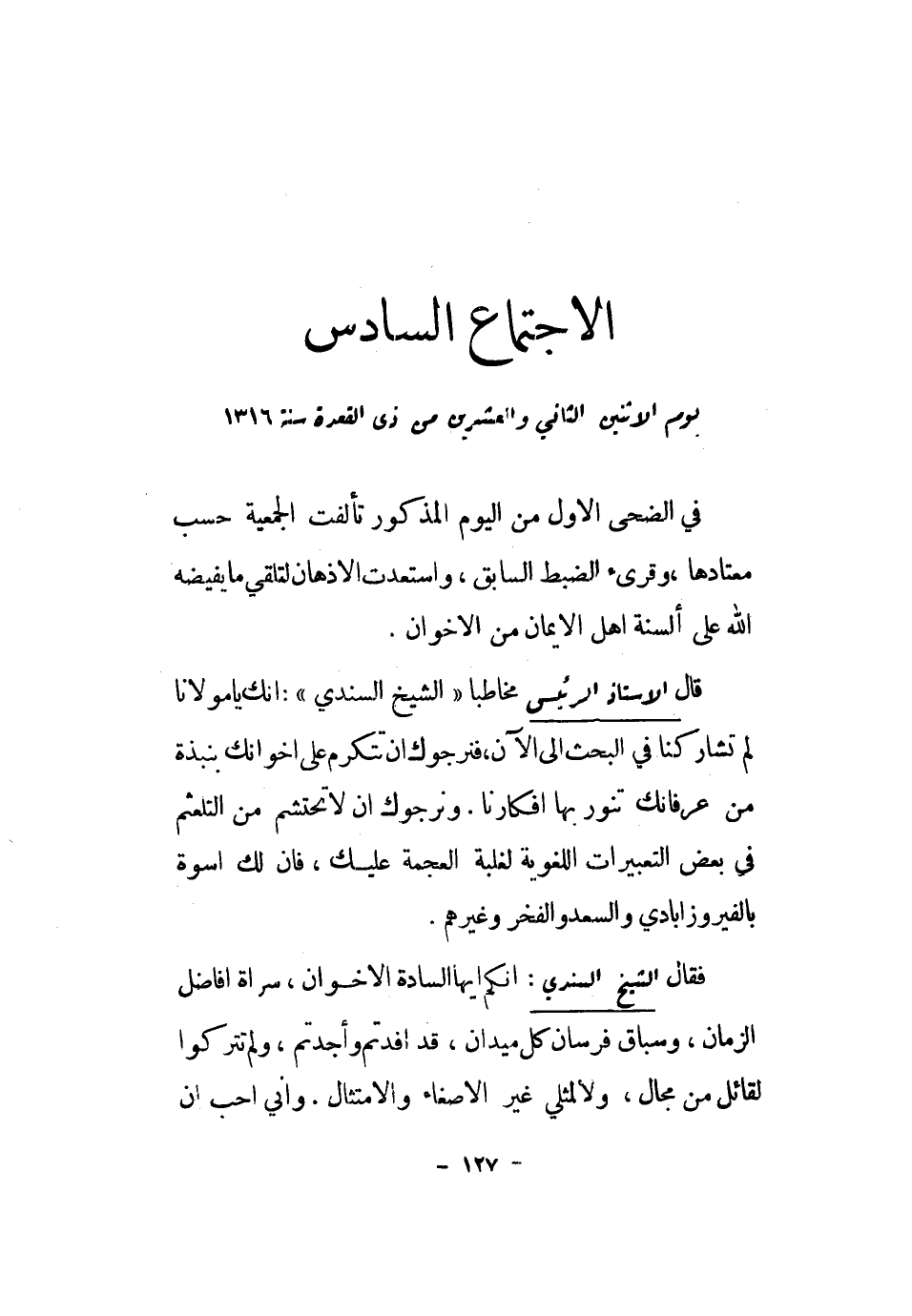 قَالَ الْأُسْتَاذ الرئيس مُخَاطبا " الشَّيْخ السندي ": إِنَّك يَا مَوْلَانَا لم تشاركنا فِي الْبَحْث إِلَى الْآن، فنرجوك أَن تتكرم على إخوانك بنبذة من عرفانك تنور بهَا أفكارنا. ونرجوك أَن لَا تحتشم من التلعثم فِي بعض التعبيرات اللُّغَوِيَّة لغَلَبَة العجمة عَلَيْك، فَإِن لَك أُسْوَة بالفيروز أبادي والسعد وَالْفَخْر وَغَيرهم.