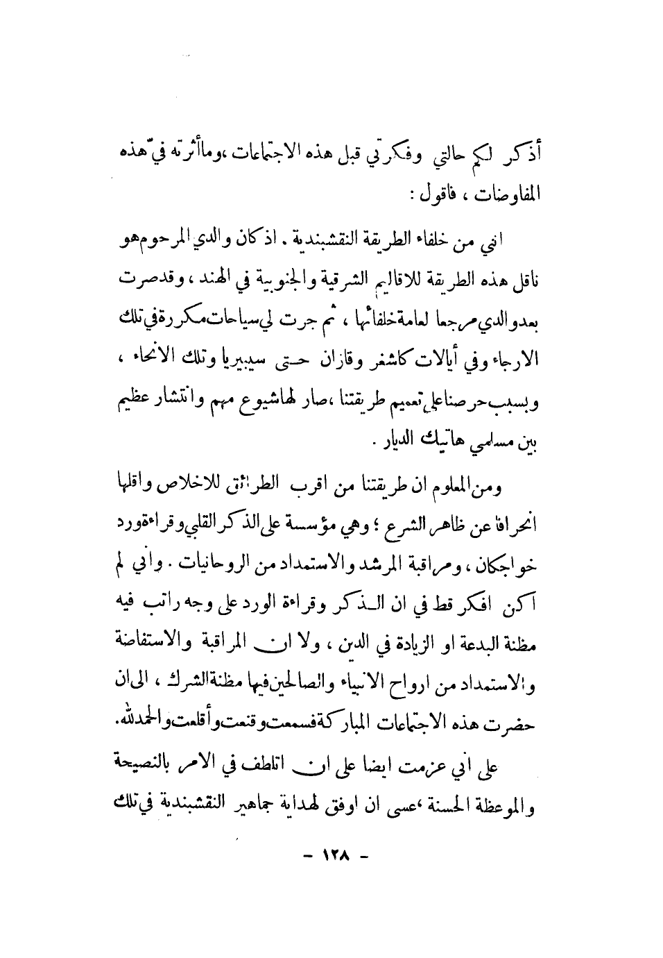 وَمن الْمَعْلُوم أَن طريقتنا من أقرب الطرائق للإخلاص وأقلها انحرافا عَن ظَاهر الشَّرْع؛ وَهِي مؤسسة على الذّكر القلبي وَقِرَاءَة ورد خواجكان، ومراقبة المرشد والاستمداد من الروحانيات، وَإِنِّي لم اكن أفكر قطّ فِي أَن الذّكر وَقِرَاءَة الْورْد على وَجه راتب فِيهِ مَظَنَّة الْبِدْعَة أَو الزِّيَادَة فِي الدّين، وَلَا أَن المراقبة والاستفاضة والاستمداد من أَرْوَاح الْأَنْبِيَاء وَالصَّالِحِينَ فِيهَا مَظَنَّة الشّرك، إِلَى أَن حضرت هَذِه الاجتماعات الْمُبَارَكَة فَسمِعت وقنعت وأقلعت وَالْحَمْد لله.