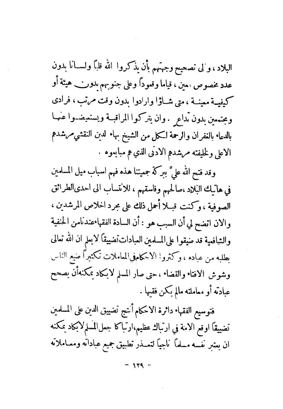 وَقد فتح الله عَليّ ببركة جمعيتنا هَذِه فهم أَسبَاب ميل الْمُسلمين فِي هاتيك الْبِلَاد، صَالحهمْ وفاسقهم، للانتساب إِلَى إِحْدَى الطرائق الصُّوفِيَّة، وَكنت قبلا أحمل ذَلِك على مُجَرّد إخلاص المرشدين، والآن اتَّضَح لي أَن السَّبَب هُوَ: أَن السَّادة الْفُقَهَاء عندنَا من الْحَنَفِيَّة وَالشَّافِعِيَّة قد ضيقوا على الْمُسلمين الْعِبَادَات تضييقاً لَا يعلم أَن الله تَعَالَى يَطْلُبهُ من عباده، وكثروا الْأَحْكَام فِي الْمُعَامَلَات تكثيراً ضيع النَّاس وشوش الْإِفْتَاء وَالْقَضَاء، حَتَّى صَار الْمُسلم لَا يكَاد يُمكنهُ أَن يصحح عِبَادَته أَو مُعَامَلَته مَا لم يكن فَقِيها.