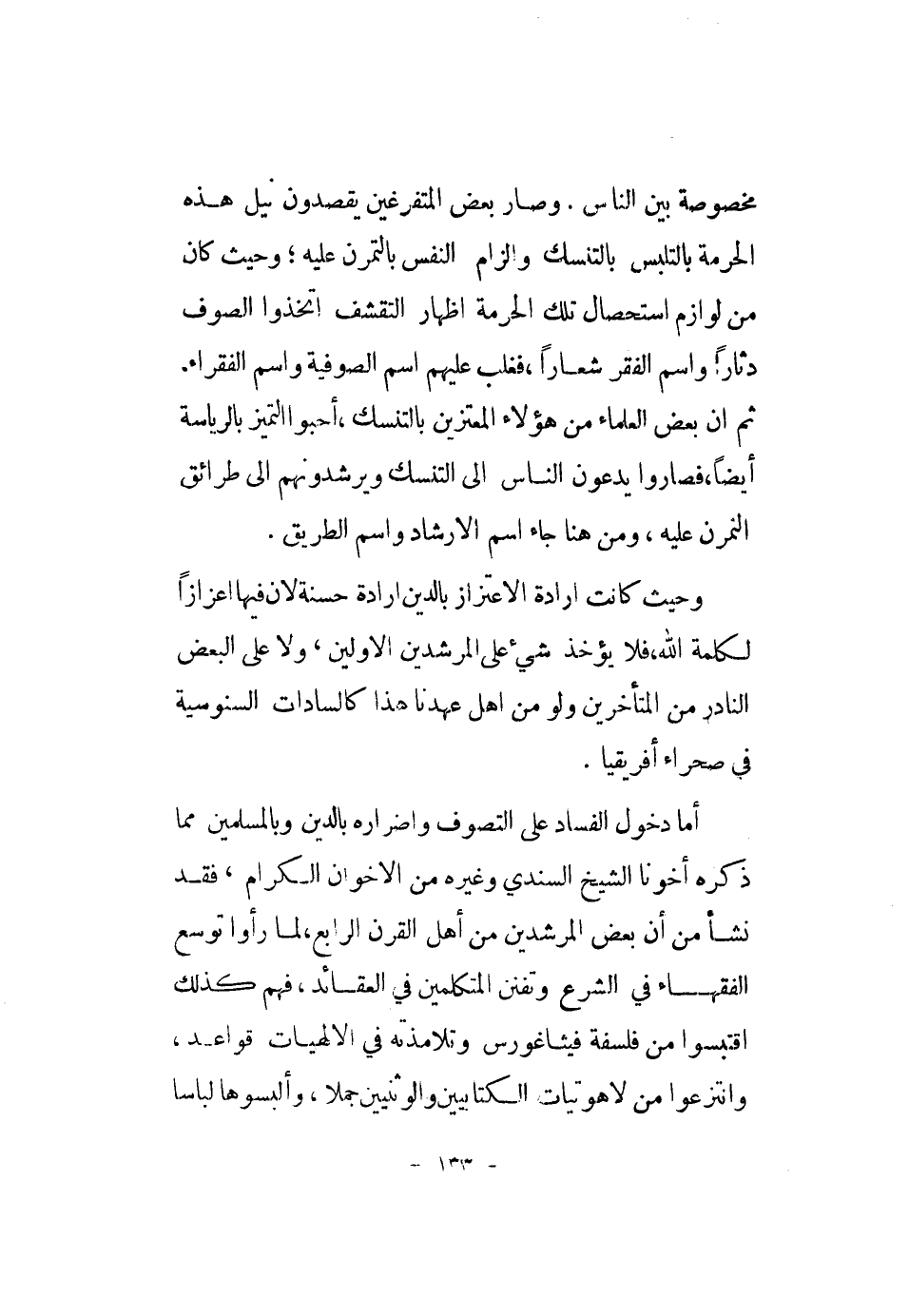 وَحَيْثُ كَانَت إِرَادَة الاعتزاز بِالدّينِ إِرَادَة حَسَنَة لِأَن فِيهَا إعزازاً لكلمة الله، فَلَا يُؤْخَذ شَيْء على المرشدين الْأَوَّلين، وَلَا على الْبَعْض النَّادِر من الْمُتَأَخِّرين وَلَو من أهل عهدنا هَذَا كالسادات السنوسية فِي صحراء إفريقيا. أما دُخُول الْفساد على التصوف وإضراره بِالدّينِ وبالمسلمين مِمَّا ذكره أخونا الشَّيْخ السندي وَغَيره من الإخوان الْكِرَام، فقد نَشأ من أَن بعض المرشدين من أهل الْقرن الرَّابِع، لما رَأَوْا توسع الْفُقَهَاء فِي الشَّرْع وتفنن الْمُتَكَلِّمين فِي العقائد، فهم كَذَلِك اقتبسوا من فلسفة فيثاغورس وتلامذته فِي الألهيات قَوَاعِد، وانتزعوا من لاهوتيات الكتابيين والوثنيين جملا، وألبسوها لباسا