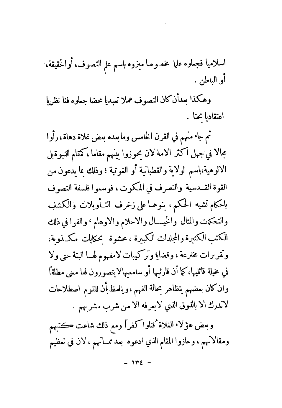 ثمَّ جَاءَ مِنْهُم فِي الْقرن الْخَامِس وَمَا بعده بعض غلاة دهاة، رَأَوْا مجالاً فِي جهل أَكثر الْأمة لِأَن يحوزوا بَينهم مقَاما، كمقام النُّبُوَّة بل الألوهية، باسم لولاية والقطبانية أَو الغوثية؛ وَذَلِكَ بِمَا يدعونَ من الْقُوَّة القدسية وَالتَّصَرُّف فِي الملكوت، فوسعوا فلسفة التصوف بِأَحْكَام تشبه الحكم، بنوها على زخرف التأويلات والكشف والتحكمات والمثال والخيال والأحلام والأوهام، وألفوا فِي ذَلِك الْكتب الْكَثِيرَة والمجلدات الْكَبِيرَة، محشوة بحكايات مكذوبة، وتقريرات مخترعة، وقضايا وتركيبات لَا مَفْهُوم لَهَا الْبَتَّةَ حَتَّى وَلَا فِي مخيلة قائليها، كَمَا أَن قارئيها أَو سامعيها لَا يتصورون لَهَا معنى مُطلقًا وَإِن كَانَ بَعضهم يتظاهر بِحَالَة الْفَهم، ويتلمظ بِأَن للْقَوْم اصْطِلَاحَات لَا تدْرك إِلَّا بالذوق الَّذِي لَا يعرفهُ إِلَّا من شرب مشربهم.