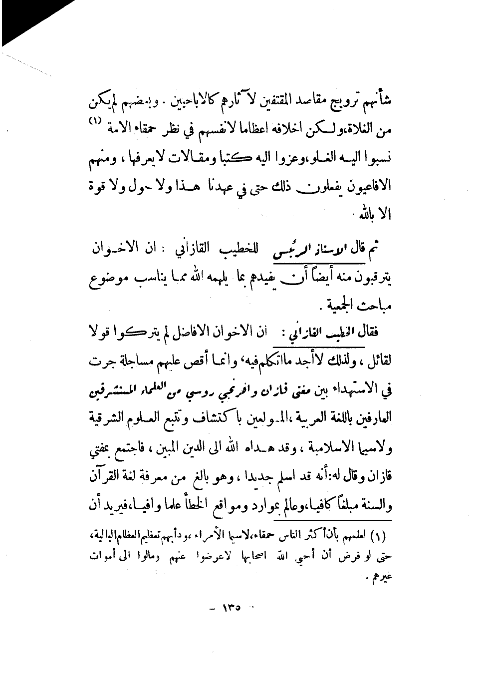 فَقَالَ الْخَطِيب القازاني: إِن الإخوان الأفاضل لم يتْركُوا قولا لقَائِل، وَلذَلِك لَا أجد مَا أَتكَلّم فِيهِ، وَإِنَّمَا أقص عَلَيْهِم مساجلة جرت فِي الاستهداء بَين مفتي قازان وإفرنجي روسي من الْعلمَاء المستشرقين العارفين باللغة الْعَرَبيَّة، المولعين باكتشاف وتتبع الْعُلُوم الشرقية وَلَا سِيمَا الإسلامية، وَقد هداه الله إِلَى الدّين الْمُبين، فَاجْتمع بمفتي قازان وَقَالَ لَهُ: أَنه قد أسلم جَدِيدا، وَهُوَ بَالغ من معرفَة لُغَة الْقُرْآن وَالسّنة مبلغا كَافِيا، وعالم بموارد ومواقع الْخَطَأ علما وافياً، فيريد أَن