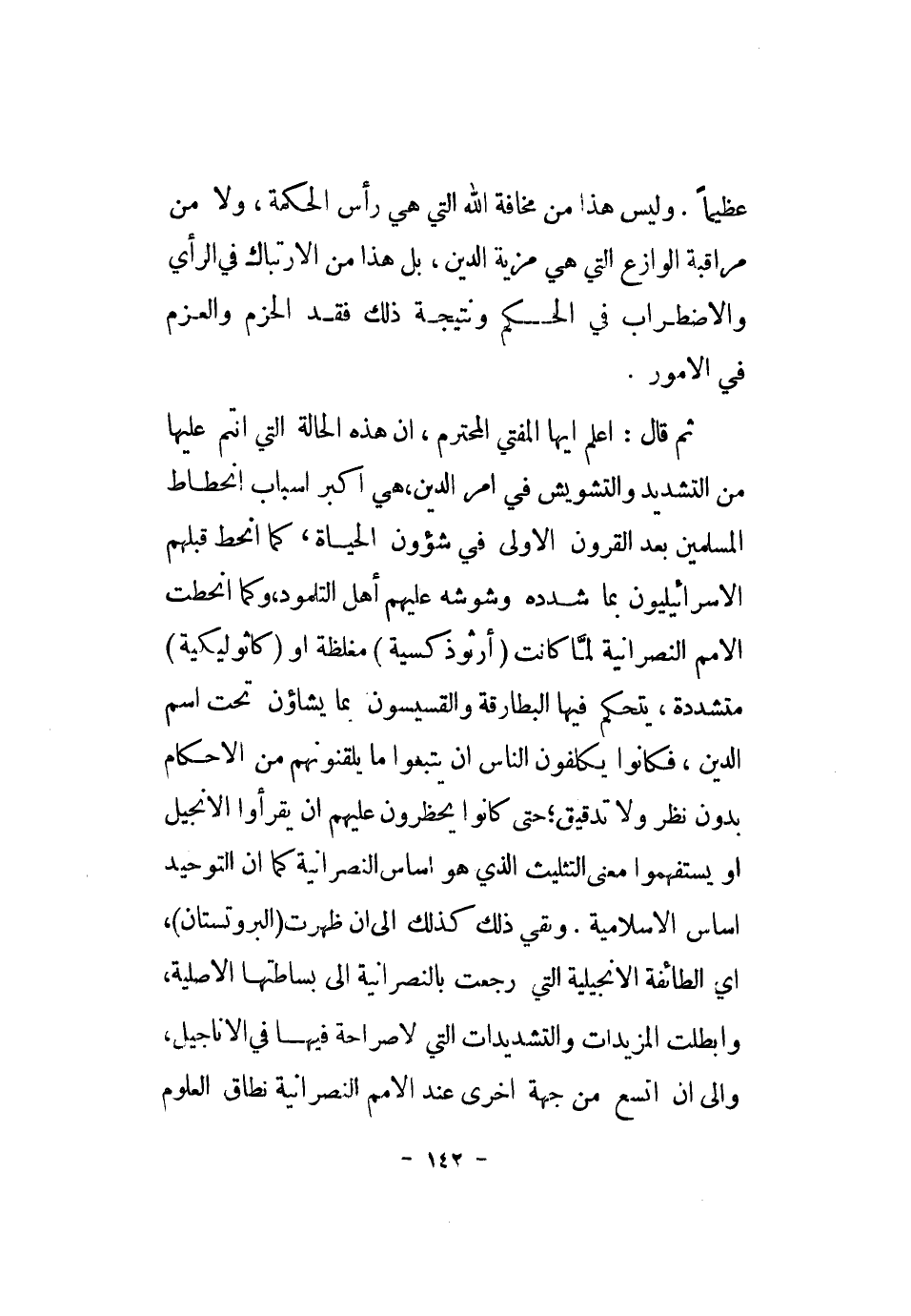 ثمَّ قَالَ: أعلم أَيهَا الْمُفْتِي الْمُحْتَرَم، أَن هَذِه الْحَالة الَّتِي أَنْتُم عَلَيْهَا من التَّشْدِيد والتشويش فِي أَمر الدّين، هِيَ اكبر أَسبَاب انحطاط الْمُسلمين بعد الْقُرُون الأولى فِي شؤون الْحَيَاة، كَمَا انحط قبلهم الإسرائيليون بِمَا شدده وشوشه عَلَيْهِم أهل التلمود، وكما انحطت الْأُمَم النَّصْرَانِيَّة لما كَانَت (أرثوذكسية) مُغَلّظَة أَو (كاثوليكية) متشددة، يتحكم فِيهَا البطارقة والقسيسون بِمَا يشاؤن تَحت اسْم الدّين، فَكَانُوا يكلفون النَّاس أَن يتبعوا مَا يلقنونهم من الْأَحْكَام بِدُونِ نظر وَلَا تدقيق؛ حَتَّى كَانُوا يحظرون عَلَيْهِم أَن يقرأوا الْإِنْجِيل أَو يستفهموا معنى التَّثْلِيث الَّذِي هُوَ أساس النَّصْرَانِيَّة كَمَا أَن التَّوْحِيد أساس الإسلامية. وَبَقِي ذَلِك كَذَلِك إِلَى أَن ظَهرت (البروتستان) ، أَي الطَّائِفَة الإنجيلية الَّتِي رجعت بالنصرانية إِلَى بساطتها الْأَصْلِيَّة، وأبطلت المزيدات والتشديدات الَّتِي لَا صَرَاحَة فِيهَا فِي الأناجيل، وَإِلَى أَن اتَّسع من جِهَة أُخْرَى عِنْد الْأُمَم النَّصْرَانِيَّة نطاق الْعُلُوم