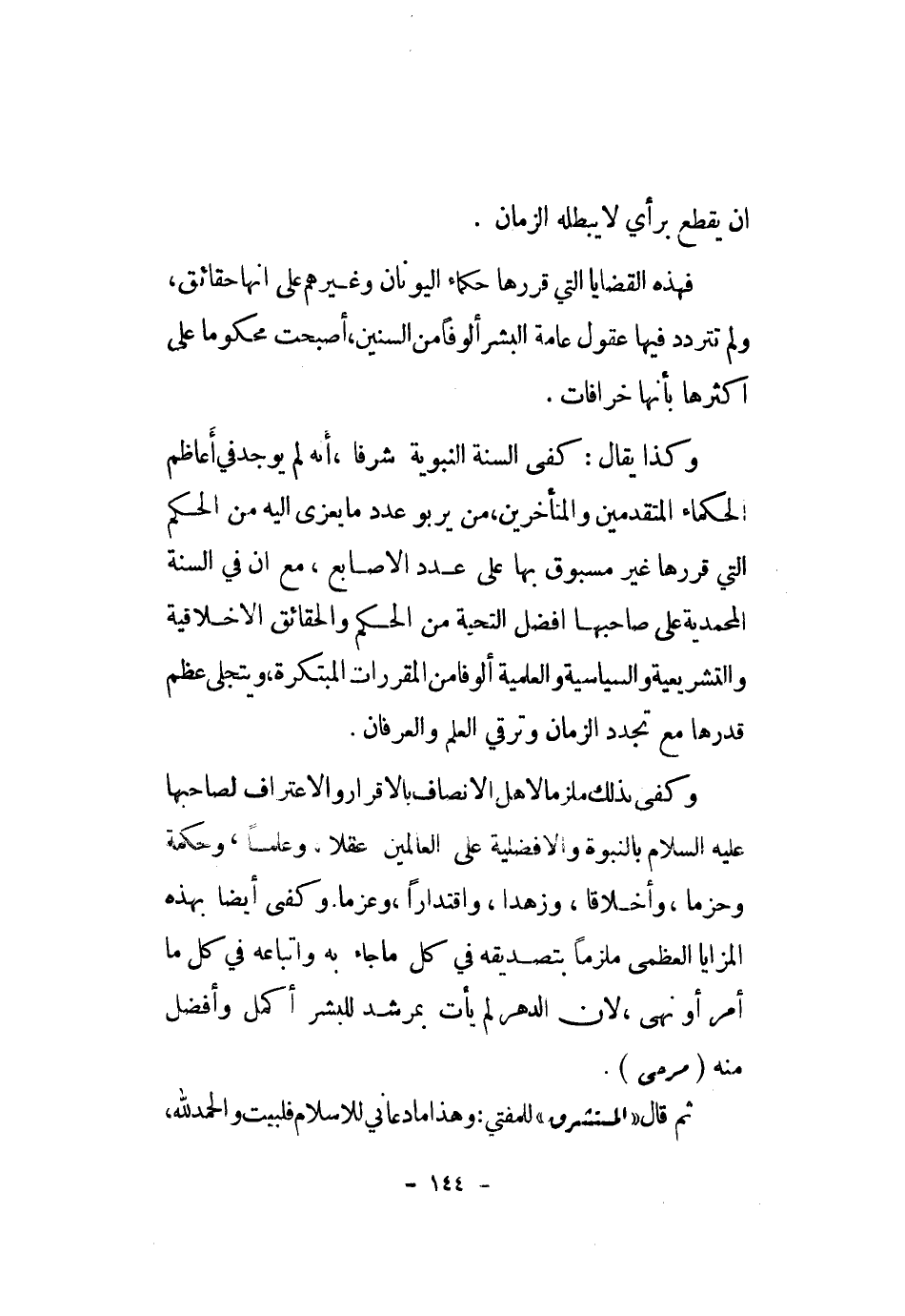 فَهَذِهِ القضايا الَّتِي قررها حكماء اليونان وَغَيرهم على أَنَّهَا حقائق، وَلم تَتَرَدَّد فِيهَا عقول عَامَّة الْبشر ألوفاً من السنين، أَصبَحت مَحْكُومًا على أَكْثَرهَا بِأَنَّهَا خرافات. وَكَذَا يُقَال: كفى السّنة النَّبَوِيَّة شرفاً، انه لم يُوجد فِي أعاظم الْحُكَمَاء الْمُتَقَدِّمين والمتأخرين، من يَرْبُو عدد مَا يعزى إِلَيْهِ من الحكم الَّتِي قررها غير مَسْبُوق بهَا على عدد الْأَصَابِع، مَعَ أَن فِي السّنة المحمدية على صَاحبهَا أفضل التَّحِيَّة من الحكم والحقائق الأخلاقية والتشريعية والسياسية والعلمية ألوفا من المقررات المبتكرة، ويتجلى عظم قدرهَا مَعَ تجدّد الزَّمَان وترقي الْعلم والعرفان.