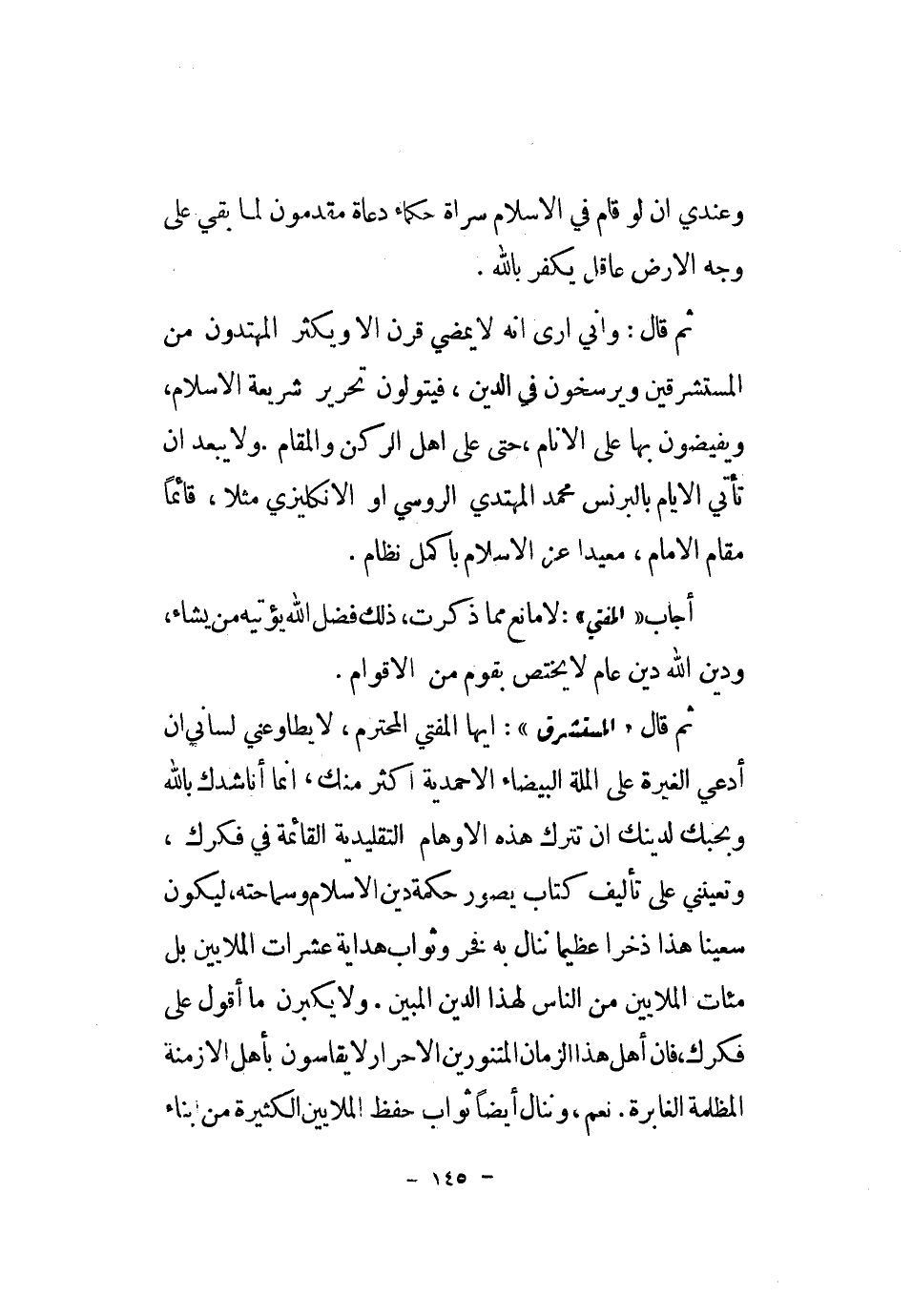 ثمَّ قَالَ " المستشرق ": أَيهَا الْمُفْتِي الْمُحْتَرَم، لَا يطاوعني لساني أَن أَدعِي الْغيرَة على الْملَّة الْبَيْضَاء الأحمدية أَكثر مِنْك، إِنَّمَا أناشدك بِاللَّه وبحبك لدينك أَن تتْرك هَذِه الأوهام التقليدية الْقَائِمَة فِي فكرك، وتعينني على تأليف كتاب يصور حِكْمَة دين الْإِسْلَام وسماحته، ليَكُون سعينا هَذَا ذخْرا عَظِيما ننال بِهِ فَخر وثواب هِدَايَة عشرات الملايين بل مئات الملايين من النَّاس لهَذَا الدّين الْمُبين. وَلَا يكبرن مَا أَقُول على فكرك، فَإِن أهل هَذَا الزَّمَان المتنورين الْأَحْرَار لَا يقاسون بِأَهْل الْأَزْمِنَة الْمظْلمَة الغابرة. نعم، وننال أَيْضا ثَوَاب حفظ الملايين الْكَثِيرَة من أَبنَاء